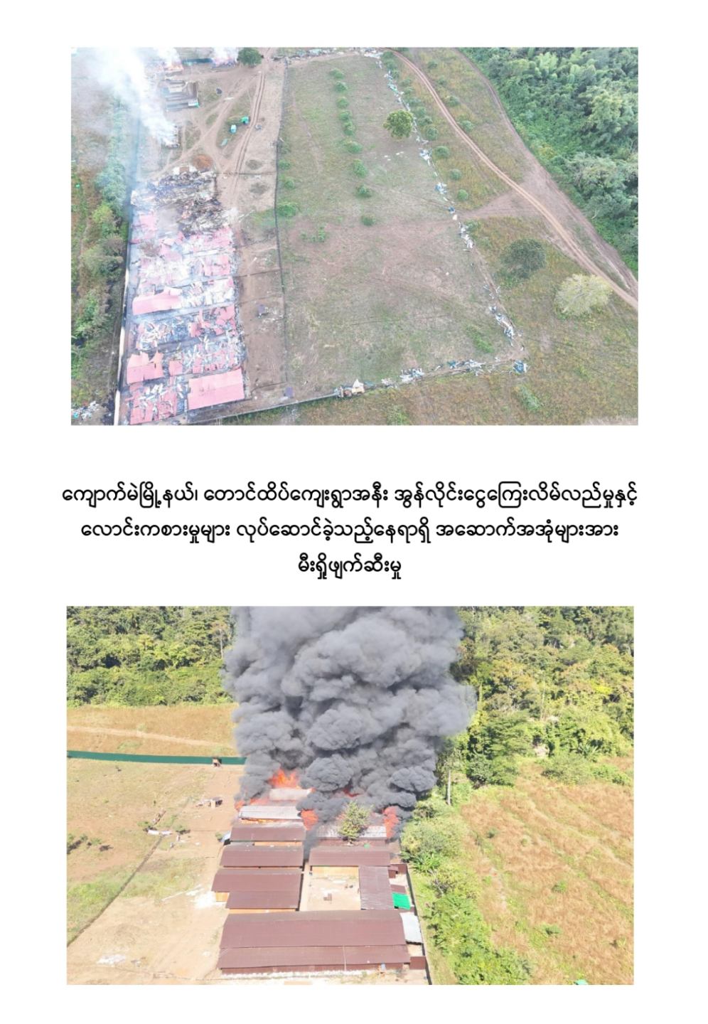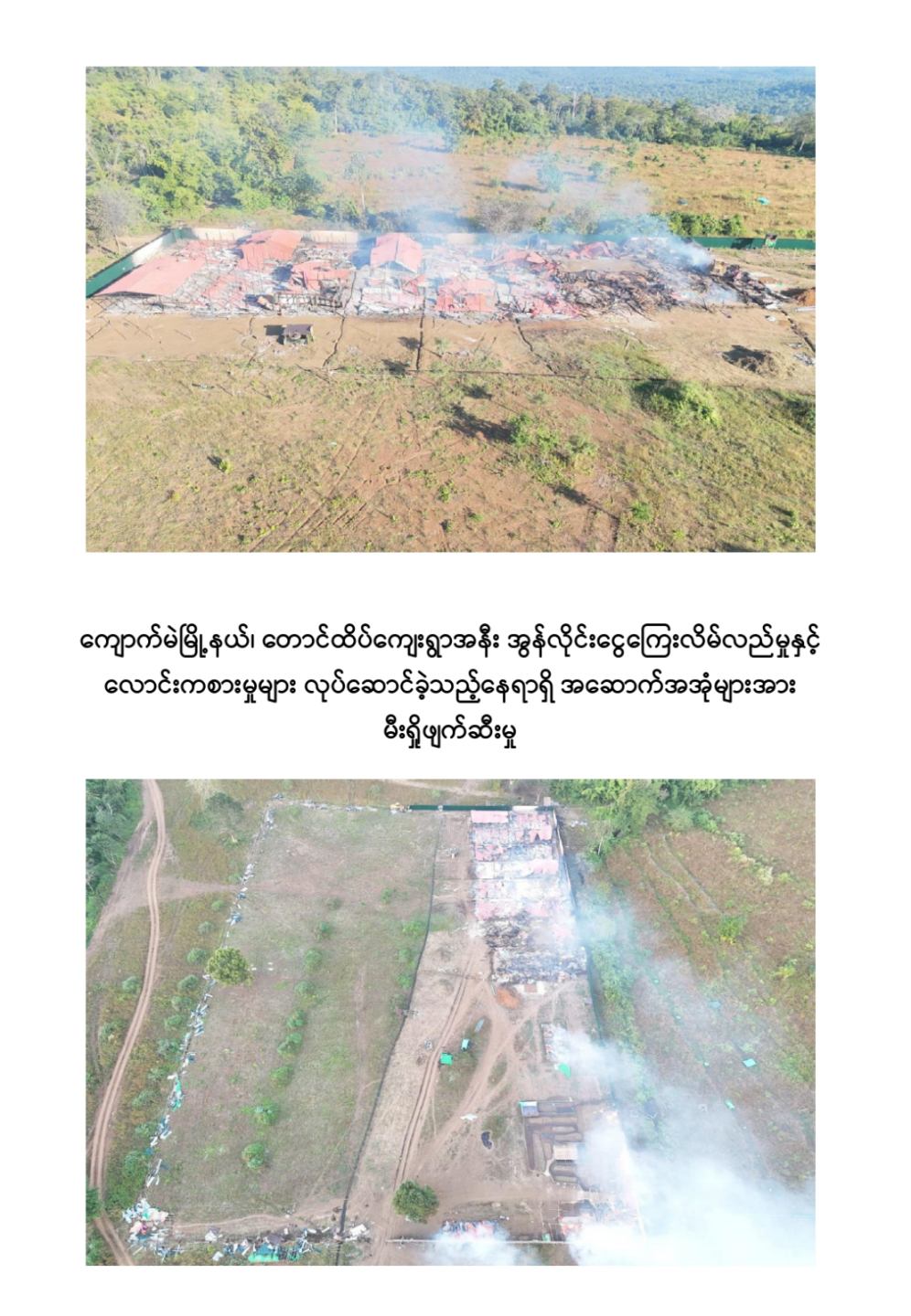 ကျောက်မဲမြို့နယ်အတွင်း နယ်မြေလုံခြုံရေးဆောင်ရွက်နေသည့် လုံခြုံရေးတပ်ဖွဲ့ဝင်များသည် နိုဝင်ဘာ ၃၀ ရက်တွင် ကျောက်မဲမြို့နယ်၊ တောင်ထိပ်ကျေးရွာ၏တောင်ဘက် ဒုဋ္ဌဝတီမြစ်အနီးသို့ရောက်ရှိစဉ် မသင်္ကာဖွယ်ရာအဆောက်အအုံများကိုတွေ့ရှိရသဖြင့် ဝင်ရောက်ရှာဖွေစစ်ဆေးခဲ့ရာ အွန်လိုင်းငွေကြေးလိမ်လည်မှုနှင့် လောင်းကစားမှုများ လုပ်ဆောင်နေသည့်နေရာဖြစ်ကြောင်းတွေ့ရှိရပြီး လုပ်ငန်းလုပ်ကိုင်နေကြသူများအား မတွေ့ရှိရဘဲ အလျား ၆၀ ပေ၊ အနံ ၃၀ ပေ ရှိ သွပ်မိုး ၃ ထပ်သားကာ အိပ်ဆောင် ၆ လုံး၊ အလျား ၆၀ ပေ၊ အနံ ၃၀ ပေ ရှိ သွပ်မိုး ၃ ထပ်သားကာ လုပ်ငန်းဆောင် ၅ လုံး၊ အလျား ၆၀ ပေ၊ အနံ ၃၀ ပေ ရှိ သွပ်မိုး ၃ ထပ်သားကာ အစားအစာသိုလှောင်ရုံ ၆ လုံး၊ အလျား ၆၀ ပေ၊ အနံ ၃၀ ပေ ရှိ ဆောက်လုပ်ဆဲလုပ်ငန်းဆောင် ၁ လုံး၊ အလျား ၆၀ ပေ၊ အနံ ၃၀ ပေ ရှိ ဆောက်လုပ်ဆဲအိပ်ဆောင် ၁ လုံး၊ အလျား ၈၀ ပေ၊ အနံ ၁၅ ပေ ရှိအထွေထွေသုံးအဆောင် ၁ လုံး၊ အလျား ၈၀ ပေ၊ အနံ ၁၀ ပေ ရှိ ၃ထပ်သားကာ တန်းလျားရှည်အိမ်သာ အိမ်သာ ၁ လုံး၊ အလျား ၃၀ ပေ၊ အနံ ၁၀ ပေ ရှိ အိပ်ခန်းတွဲ ၄ ခန်းတွဲအိပ်ဆောင် ၁ လုံး၊ အိပ်ခန်း ၄ ခန်းတွဲ(ရိက္ခာစတိုပါ) နှစ်ထပ်ဆောင် ၁ လုံး၊ မီးစက်အကြီး ၁ လုံး၊ ၁၅ ပေအမြင့် ကင်းစောင့် သစ်သား မျှော်စင် ၅ လုံး၊ အလျား ၂၀ ပေ၊ အနံ ၁၀ ပေ၊ အိပ်ဆောင်တန်းလျား ၁ လုံး၊ အလျား ၇၀၀ ပေ၊ အနံ ၄၀၀ ပေ၊ သွပ်ကာခြံဝန်း ၁ ခု၊ ALL IN ONE DESKTOP ကွန်ပျူတာ ၃၀ လုံး၊ STAR LINK ဗန်း ၁၀ ခု AIR COOLER ၁ လုံး၊ XIAOMI ဝိုင်ဖိုင်စက် ၂ လုံး၊ SOUND BOX ၁ လုံး၊ POWER STATION ၃ လုံး၊ ငွေရေတွက်စက် ၁ လုံး၊ ငွေကဒ်ဖြတ်စက် ၃ လုံး၊ ကွန်ပျူတာ ဆက်စပ်ပစ္စည်းများနှင့် အခြားလျှပ်စစ်သုံးပစ္စည်းများကို တွေ့ရှိသိမ်းဆည်းရမိခဲ့ကြောင်း သိရှိရသည်။
