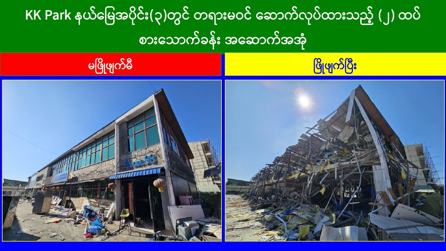 ထိုသို့ဆောင်ရွက်လျက်ရှိရာ ယနေ့တွင် မြဝတီ-မဲထော်သလေး (KK Park) အပိုင်း (၃) နယ်မြေအတွင်းရှိ တရားမဝင်အဆောက်အအုံများဖြစ်သော ၁ ထပ် အဆောက်အုံ ၁ လုံး၊ ၂ ထပ်အဆောက်အအုံ ၄ လုံး၊ ၄ ထပ်အဆောက်အအုံ ၂ လုံး၊ စုစုပေါင်း တရားမဝင်အဆောက်အအုံ ၇ လုံးကို ထပ်မံဖြိုချဖျက်ဆီးခဲ့သဖြင့် အပိုင်း (၃) နယ်မြေအတွင်းရှိ အဆောက်အအုံ ၄၂၅ လုံးအနက် ယနေ့အထိ ၁၃၅ လုံး ဖြိုချဖျက်ဆီးခဲ့ကြောင်းနှင့် KK Park နယ်မြေအတွင်းရှိ တရားမဝင်အဆောက်အအုံ စုစုပေါင်း ၆၃၅ လုံး အနက် ၂၈၃ လုံးကို ဖြိုချဖျက်ဆီးပြီးဖြစ်ကြောင်း သိရှိရသည်။