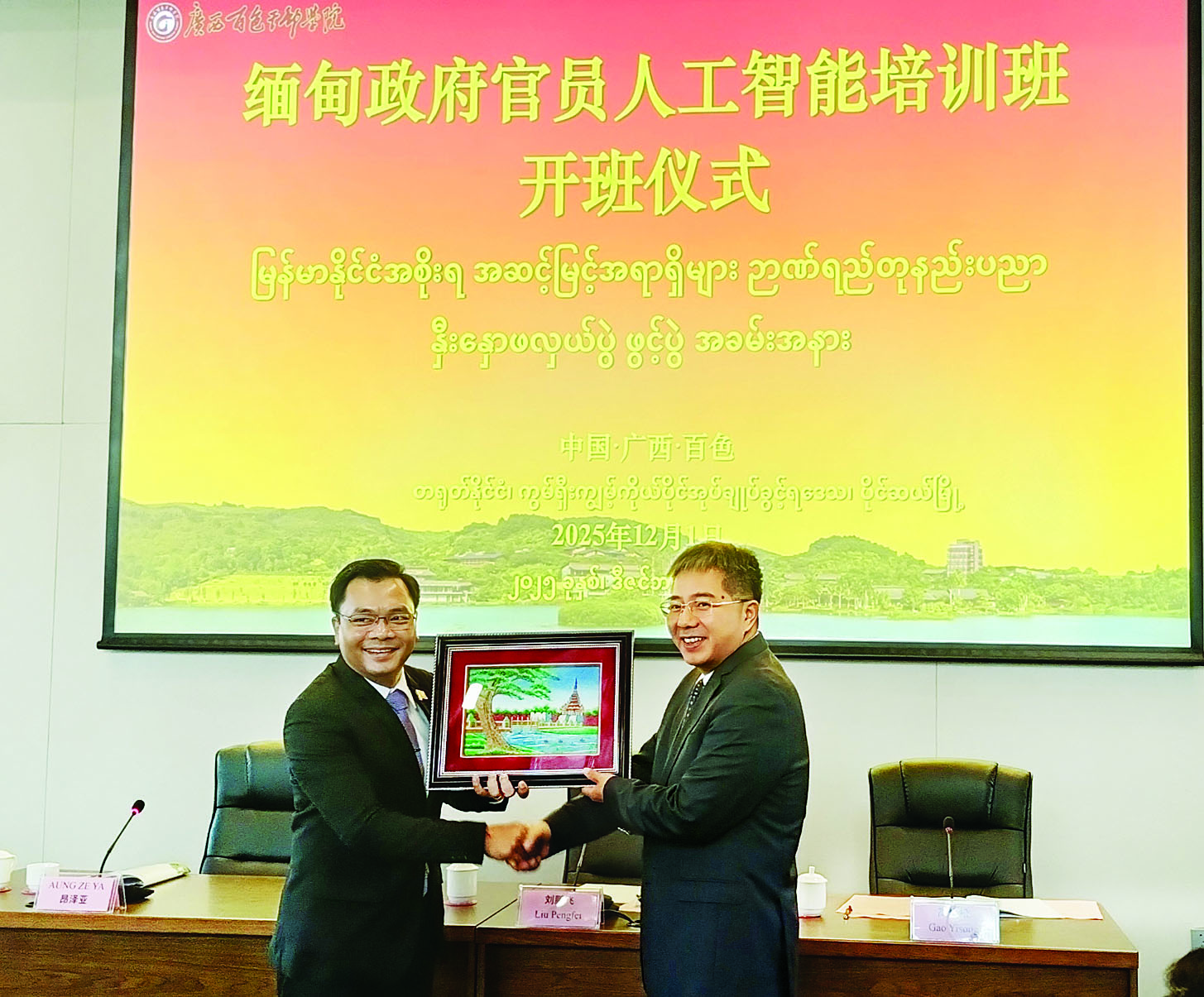 မြန်မာနိုင်ငံနှင့် ဉာဏ်ရည်တုနည်းပညာ နှီးနှောဖလှယ်ပွဲ ပထမနေ့ကို ဒီဇင်ဘာ ၁ ရက် နံနက်ပိုင်းက တရုတ်ပြည်သူ့သမ္မတနိုင်ငံ ကွမ်ရှီးကျွမ့်ကိုယ်ပိုင် အုပ်ချုပ်ခွင့်ရဒေသ ပိုင်ဆယ်မြို့ရှိ ပိုင်ဆယ်အစိုးရ အရာရှိများကောလိပ်၌ကျင်းပရာ ဆန်းသစ်တီထွင်မှုနှင့် ဒစ်ဂျစ်တယ်အတတ်ပညာ မြှင့်တင်ရေးလုပ်ငန်းကော်မတီဥက္ကဋ္ဌ သိပ္ပံနှင့်နည်းပညာဝန်ကြီးဌာန ဒုတိယဝန်ကြီး ဒေါက်တာအောင်ဇေယျ ဦးဆောင်သော မြန်မာကိုယ်စားလှယ်အဖွဲ့ တက်ရောက်ခဲ့သည်။