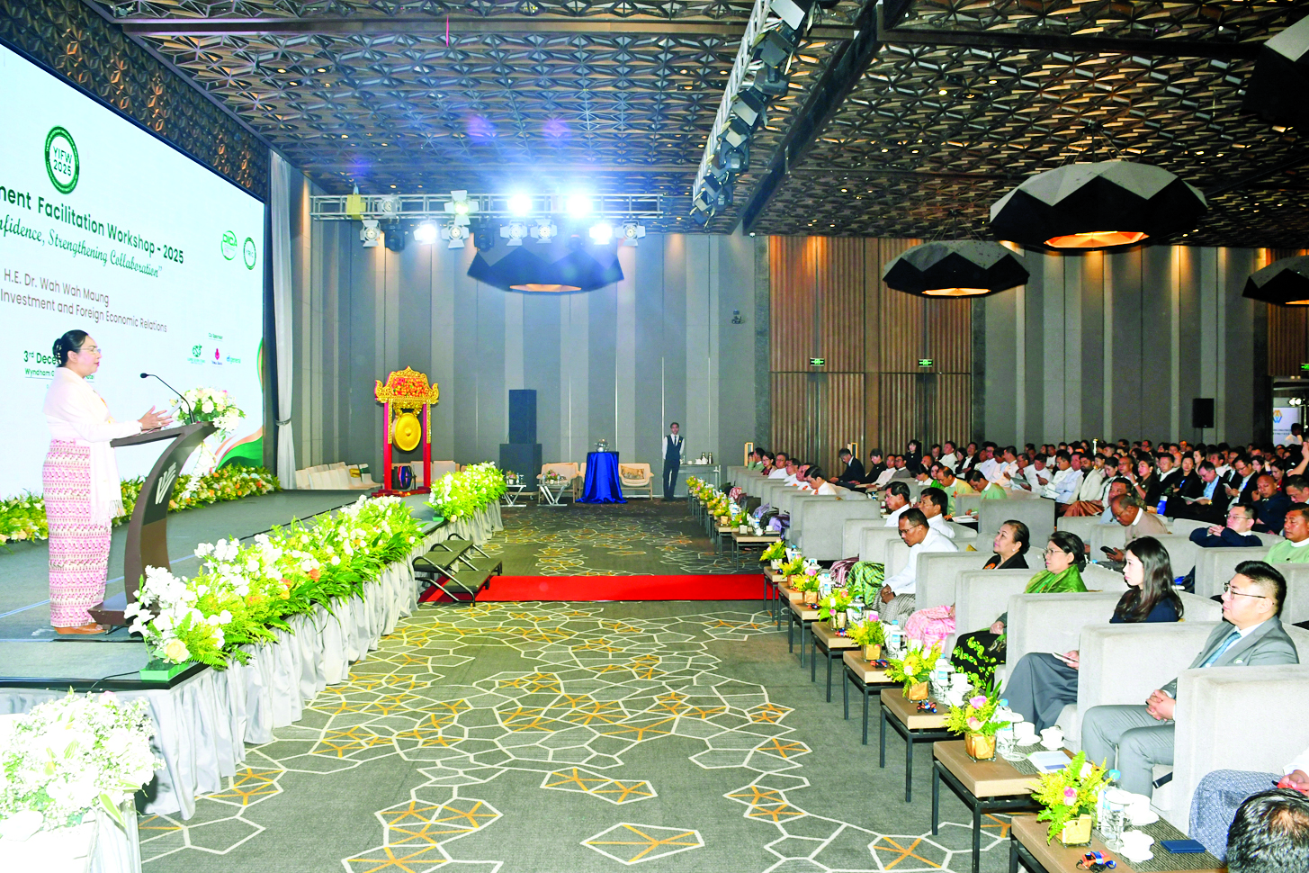 ရင်းနှီးမြှုပ်နှံမှုနှင့်နိုင်ငံခြားစီးပွားဆက်သွယ်ရေးဝန်ကြီးဌာနနှင့် ရန်ကုန်တိုင်းဒေသကြီးအစိုးရအဖွဲ့တို့၏ ဦးဆောင်ကြီးကြပ်မှုဖြင့် ရန်ကုန်တိုင်းဒေသကြီး ရင်းနှီးမြှုပ်နှံမှုကော်မတီ၏ ရင်းနှီးမြှုပ်နှံမှု လွယ်ကူချောမွေ့စေရေးဆွေးနွေးပွဲ - ၂၀၂၅ (Yangon Investment Facilitation Workshop-2025) ကို ယနေ့နံနက်ပိုင်းတွင် ရန်ကုန်မြို့ရှိ Wyndham Grand Yangon Hotel ၌ ကျင်းပသည်။