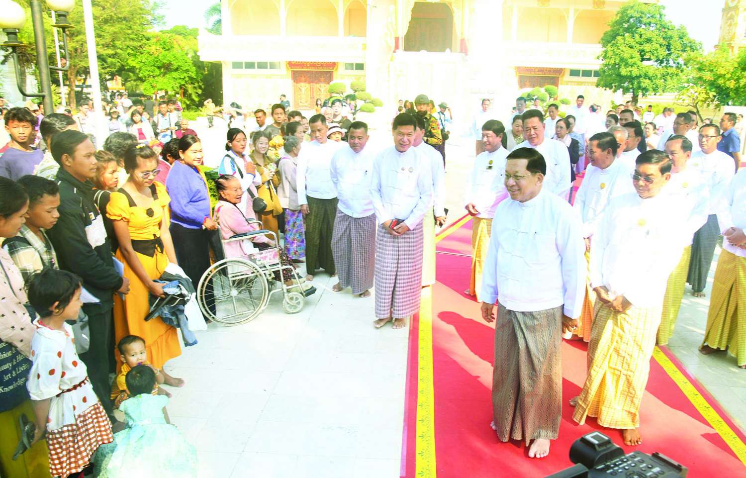 ထို့နောက် နိုင်ငံတော်ယာယီသမ္မတ နိုင်ငံတော်လုံခြုံရေးနှင့်အေးချမ်းသာယာရေးကော်မရှင်ဥက္ကဋ္ဌသည် ဘုရားစောင်းတန်းနေရာသို့ ရောက်ရှိပြီး ဘုရားစောင်းတန်းများသည် ဘုရားဖူးလာမိဘပြည်သူများ စိတ်အေးချမ်းသာစွာဖြင့် သွားလာနိုင်ရန် ဆောင်ရွက်ပေးထားခြင်းဖြစ်သဖြင့် စနစ်တကျဖြစ်ရန်လိုကြောင်းဖြင့် တာဝန်ရှိသူများကို လမ်းညွှန်မှာကြားခဲ့ပြီး ဘုရားဖူးလာရောက်ကြသည့် ဘုရားဖူးလာ မိဘပြည်သူများအား ရင်းရင်းနှီးနှီး နှုတ်ဆက်ခဲ့ကြောင်း သတင်းရရှိသည်။