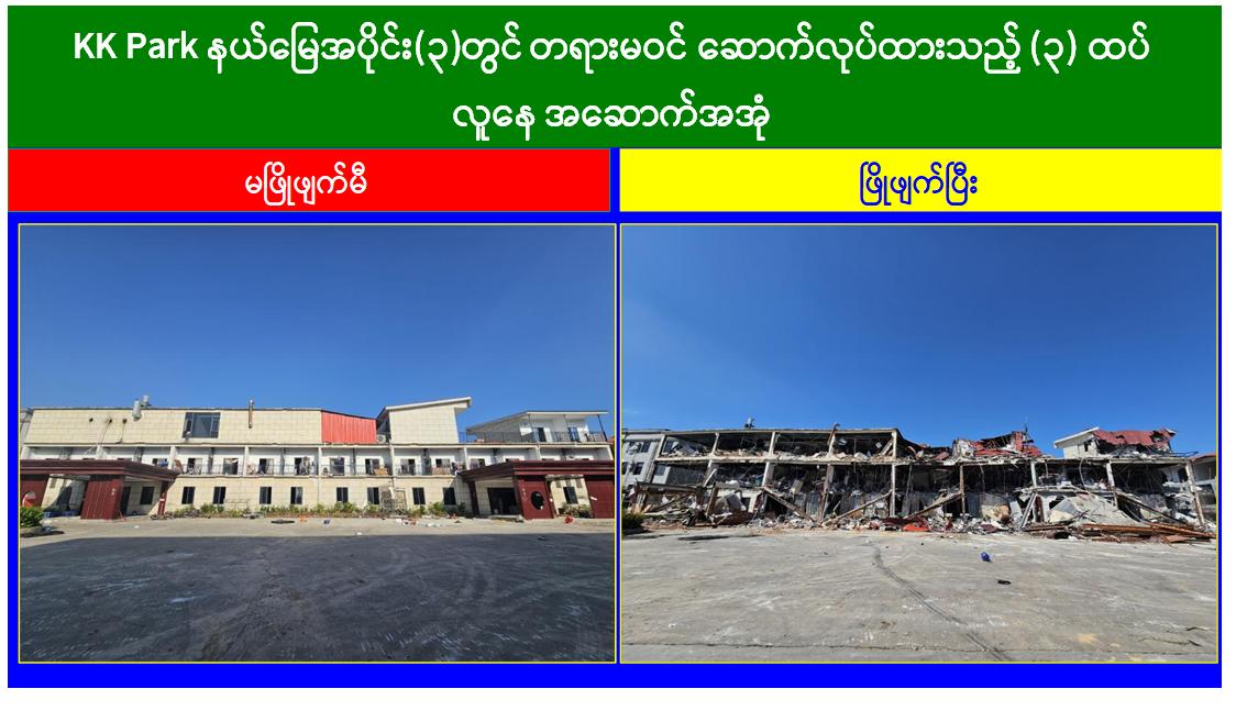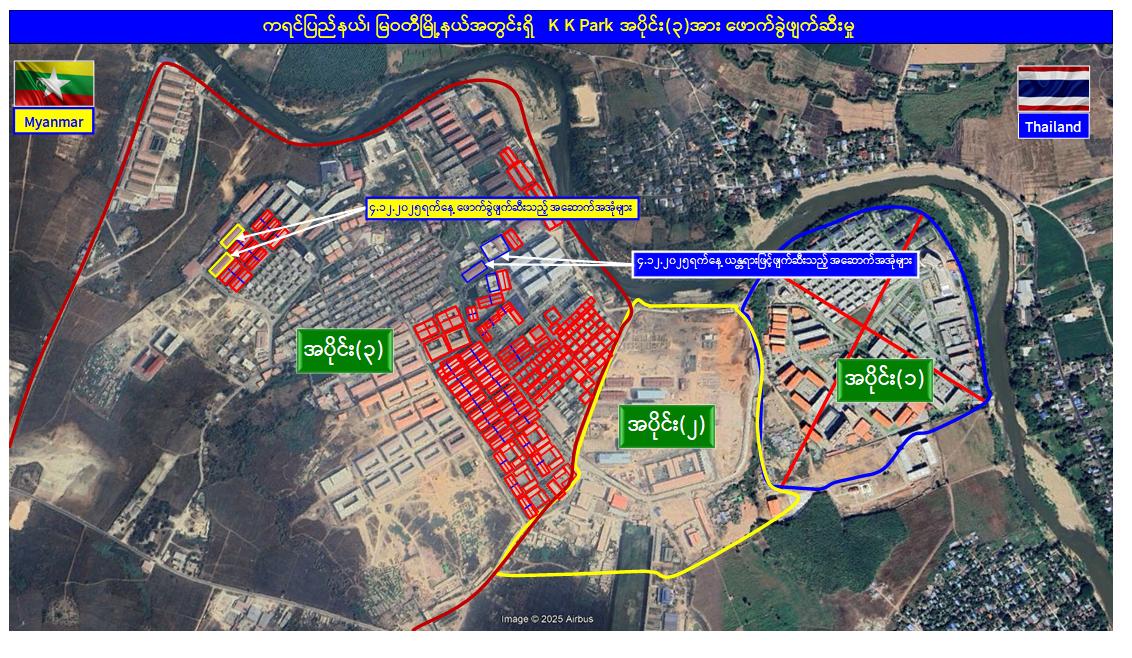 ယနေ့တွင် မြဝတီ-မဲထော်သလေး (KK Park) အပိုင်း(၃)နယ်မြေအတွင်းရှိ တရားမဝင်အဆောက်အအုံများဖြစ်သော ၂ ထပ်အဆောက်အအုံ ၁ လုံး၊ ၃ ထပ်အဆောက်အအုံ ၂ လုံး၊ ၄ ထပ်အဆောက်အအုံ ၁ လုံး၊ စုစုပေါင်း တရားမဝင်အဆောက်အအုံ ၄ လုံးကို ထပ်မံဖြို ချဖျက်ဆီးခဲ့သဖြင့် အပိုင်း(၃)နယ်မြေအတွင်းရှိ အဆောက်အအုံ ၄၂၅ လုံးအနက် ယနေ့အထိ ၁၄၉ လုံး ဖြိုချဖျက်ဆီးခဲ့ကြောင်းနှင့် KK Park နယ်မြေအတွင်းရှိ တရားမဝင် အဆောက်အအုံ စုစုပေါင်း ၆၃၅ လုံးအနက် ၂၉၇ လုံးကို ဖြိုချဖျက်ဆီးပြီးဖြစ်ကြောင်း သိရှိရသည်။