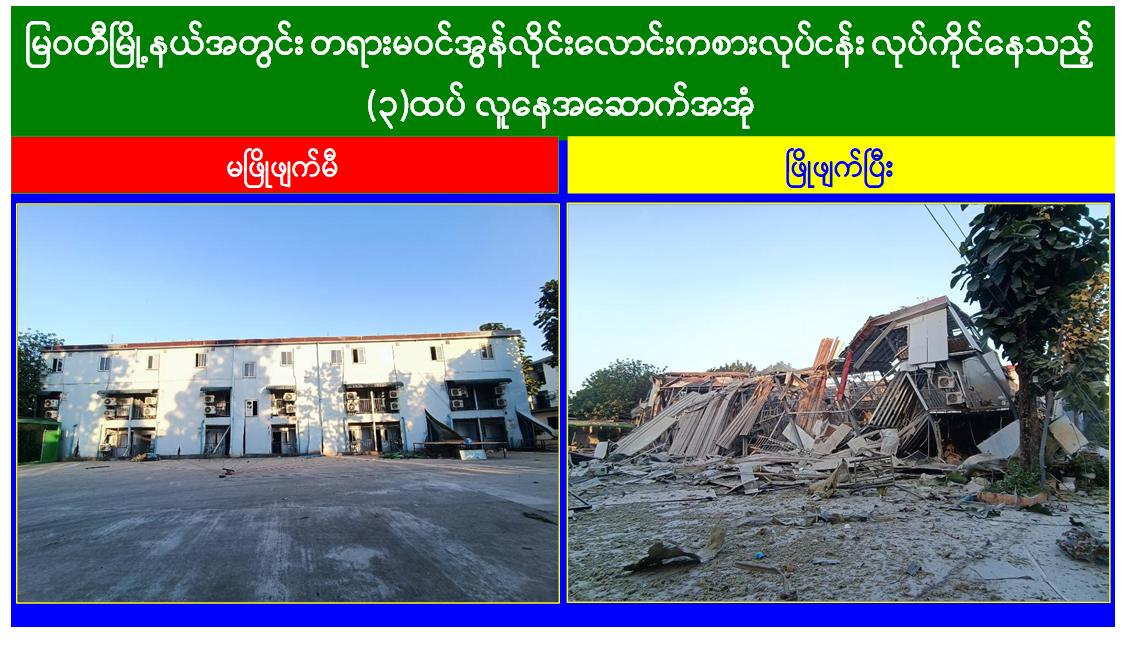 အွန်လိုင်းလောင်းကစားမှုများ၊ အွန်လိုင်းလိမ်လည်မှုများအပါအဝင် ဒုစရိုက်မှုများ ကျူးလွန်ခဲ့ကြသူများအား အင်တိုက်အားတိုက်ဖြင့် ကျယ်ကျယ်ပြန့်ပြန့် ရှာဖွေဖမ်းဆီး အရေးယူခြင်းများ ဆောင်ရွက်လျက်ရှိရာ ယနေ့တွင် မြဝတီမြို့ရှိ လုံခြုံရေးပူးပေါင်းအဖွဲ့များက သတင်းအရ မြဝတီမြို့ဝန်းကျင်တွင် ရှောင်တခင်စစ်ဆေးခြင်းများ ဆောင်ရွက်ခဲ့ရာ အမှတ်(၃) ရပ်ကွက်တွင် တရားမဝင်အွန်လိုင်းလောင်းကစားမှုများ၊ အွန်လိုင်းလိမ်လည်မှုများ ကျူးလွန်လျက်ရှိကြသည့် တရုတ်နိုင်ငံသား ၂၅ ဦး၊ မြန်မာနိုင်ငံသား ၂၂၃ ဦး စုစုပေါင်း ၂၄၈ ဦးအား တရားမဝင်အွန်လိုင်းလောင်းကစားနှင့် ငွေကြေးလိမ်လည်မှုများတွင် အသုံးပြုသည့် ကွန်ပျူတာမျိုးစုံ ၈၂ လုံး၊ မိုဘိုင်းဖုန်း ၉၂ လုံးနှင့် ဆက်စပ်ပစ္စည်းများနှင့်အတူ ဖမ်းဆီးရမိခဲ့ပြီး အဆိုပါဖမ်းဆီးရမိသူများအား ဥပဒေလုပ်ထုံးလုပ်နည်းများနှင့်အညီ စနစ်တကျ အရေးယူဆောင်ရွက်သွားမည်ဖြစ်သည်။ ထို့ပြင် အွန်လိုင်းလိမ်လည်မှုနှင့် လောင်းကစားမှုလုပ်ငန်းများ နေထိုင်လုပ်ကိုင်ခဲ့ကြသည့် ၃ ထပ် အဆောက်အအုံ ၅ လုံး၊ ၁ ထပ် အဆောက်အအုံ ၃ လုံး၊ စုစုပေါင်း ၈ လုံးတို့အား စစ်ဆေးတွေ့ရှိခဲ့ရပြီး ပြန်လည်အသုံးချမှုမရှိစေရေးအတွက် ၃ ထပ်အဆောက်အအုံ ၁ လုံးကို ယနေ့တွင် စတင်၍ စနစ်တကျ ဖြိုချဖျက်ဆီးခဲ့ကြောင်း သိရှိရသည်။