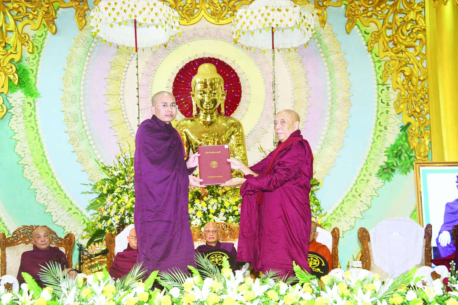 ထို့နောက် နိုင်ငံတော်ပရိယတ္တိ သာသနာ့တက္ကသိုလ် (ရန်ကုန်) မော်ကွန်းထိန်းဆရာတော် ဘဒ္ဒန္တသုမနက နိုင်ငံတော်သံဃမဟာ နာယကအဖွဲ့ဒုတိယဥက္ကဋ္ဌ တက္ကသိုလ်များအုပ်ချုပ်ရေးဗဟိုအဖွဲ့ဥက္ကဋ္ဌ မိတ္ထီလာဆရာတော် ဘဒ္ဒန္တကောဝိဒထံ ဘွဲ့ခံစာရင်းကို အတည်ပြုလက်မှတ်ရေးထိုးသည်။