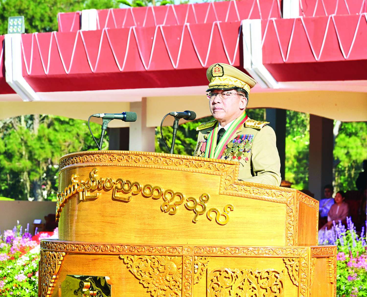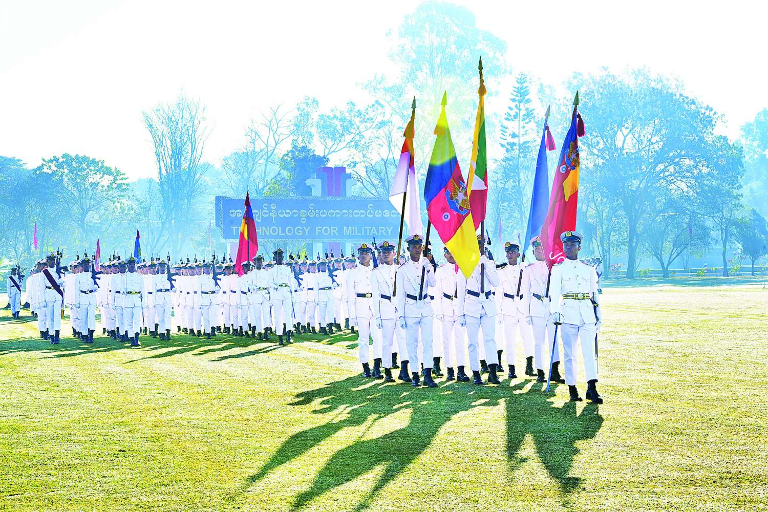 တပ်မတော်နည်းပညာတက္ကသိုလ် ဗိုလ်လောင်းသင်တန်းအမှတ်စဉ် (၂၇) သင်တန်းဆင်းဂုဏ်ပြုစစ်ရေးပြအခမ်းအနားကို ယနေ့နံနက်ပိုင်းတွင် ပြင်ဦးလွင်မြို့၊ တပ်မတော်နည်းပညာတက္ကသိုလ် စစ်ရေးပြကွင်း၌ ကျင်းပပြုလုပ်ရာ နိုင်ငံတော်လုံခြုံရေးနှင့် အေးချမ်းသာယာရေးကော်မရှင်ဥက္ကဋ္ဌ တပ်မတော်ကာကွယ်ရေးဦးစီးချုပ် ဗိုလ်ချုပ်မှူးကြီး သတိုးမဟာသရေစည်သူ သတိုးသီရိသုဓမ္မ မင်းအောင်လှိုင် တက်ရောက်မိန့်ခွန်းပြောကြားသည်။
