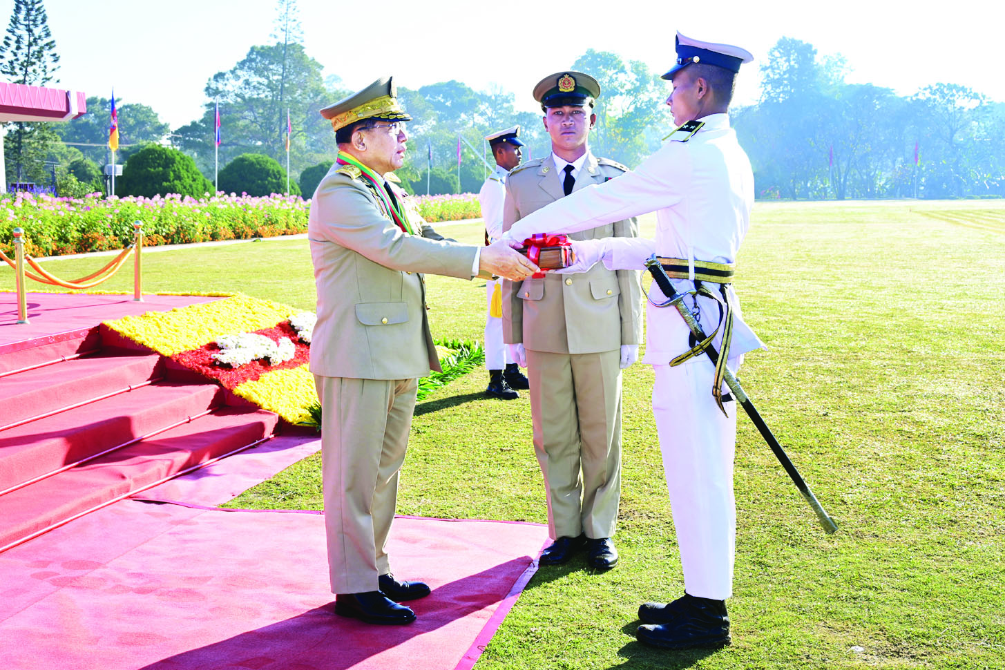 ယင်းနောက် နိုင်ငံတော်လုံခြုံရေးနှင့် အေးချမ်းသာယာရေးကော်မရှင်ဥက္ကဋ္ဌ တပ်မတော်ကာကွယ်ရေးဦးစီးချုပ် ဗိုလ်ချုပ်မှူးကြီး သတိုးမဟာသရေစည်သူ သတိုးသီရိသုဓမ္မ မင်းအောင်လှိုင်သည် ဗိုလ်လောင်းတပ်ခွဲများ၏ အလေးပြုခြင်းကို ခံယူပြီးနောက် စစ်ရေးပြအခမ်းအနားမှ ပြန်လည်ထွက်ခွာသည်။