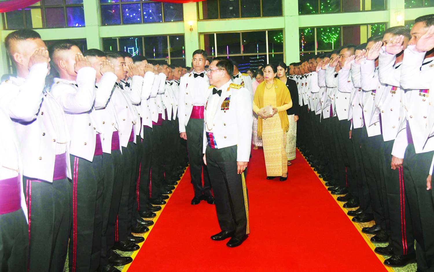 ဦးစွာ နိုင်ငံတော်လုံခြုံရေးနှင့် အေးချမ်းသာယာရေးကော်မရှင်ဥက္ကဋ္ဌ တပ်မတော်ကာကွယ်ရေးဦးစီးချုပ်က သင်တန်းဆင်းအရာရှိများအား တစ်ဦးချင်း ရင်းရင်းနှီးနှီးလိုက်လံနှုတ်ဆက်သည်။ ထို့နောက် နိုင်ငံတော်လုံခြုံရေးနှင့် အေးချမ်းသာယာရေးကော်မရှင်ဥက္ကဋ္ဌ တပ်မတော်ကာကွယ်ရေးဦးစီးချုပ်နှင့် အဖွဲ့ဝင်များသည် သင်တန်းဆင်းအရာရှိများ၊ ညစာစားပွဲတက်ရောက်လာကြသူများနှင့်အတူ ဂုဏ်ပြုညစာကို အတူတကွသုံးဆောင်ကြသည်။