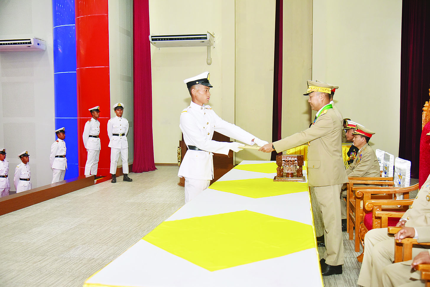 တပ်မတော်နည်းပညာတက္ကသိုလ် ဗိုလ်လောင်းသင်တန်းအမှတ်စဉ် (၂၇) ပြန်တမ်းဝင်အရာရှိခန့်အပ်ခြင်းအခမ်းအနားကို ယနေ့နံနက်ပိုင်းတွင် တပ်မတော်နည်းပညာတက္ကသိုလ် ဘွဲ့နှင်းသဘင်ခန်းမ၌ ကျင်းပရာ ကာကွယ်ရေးဦးစီးချုပ်ရုံး (ကြည်း)၊ စစ်ရာထူးခန့်ချုပ် ဒုတိယဗိုလ်ချုပ်ကြီး ထိန်ဝင်း၊ ကာကွယ်ရေးဦးစီးချုပ်ရုံးမှ တပ်မတော်အရာရှိကြီးများ၊ တပ်မတော်နည်းပညာတက္ကသိုလ်ကျောင်းအုပ်ကြီးနှင့် ကျောင်းဆင်းဗိုလ်လောင်းများ တက်ရောက်ကြသည်။