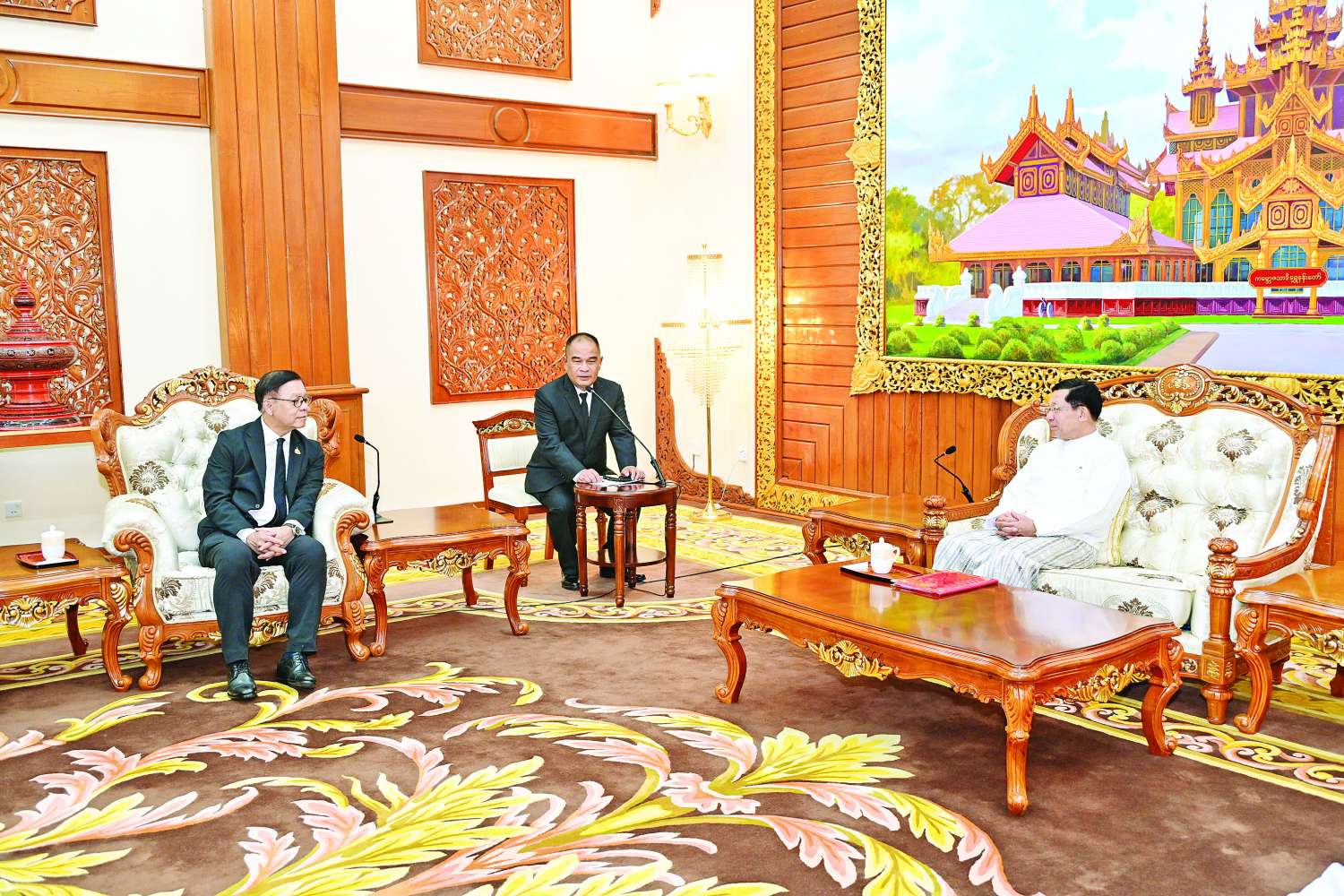 ပြည်ထောင်စုသမ္မတမြန်မာနိုင်ငံတော် ယာယီသမ္မတ နိုင်ငံတော်လုံခြုံရေးနှင့် အေးချမ်းသာယာရေးကော်မရှင်ဥက္ကဋ္ဌ ဗိုလ်ချုပ်မှူးကြီးမင်းအောင်လှိုင်ထံ ထိုင်းနိုင်ငံ၊ နိုင်ငံခြားရေးဝန်ကြီး H.E. Mr.Sihasak Phuangketkeow ဦးဆောင်သည့် ကိုယ်စားလှယ်အဖွဲ့က ယနေ့မွန်းလွဲပိုင်းတွင် နေပြည်တော်ရှိ ဘုရင့်နောင်ရိပ်သာဧည့်ခန်းမ၌ လာရောက်ဂါရဝပြုတွေ့ဆုံသည်။