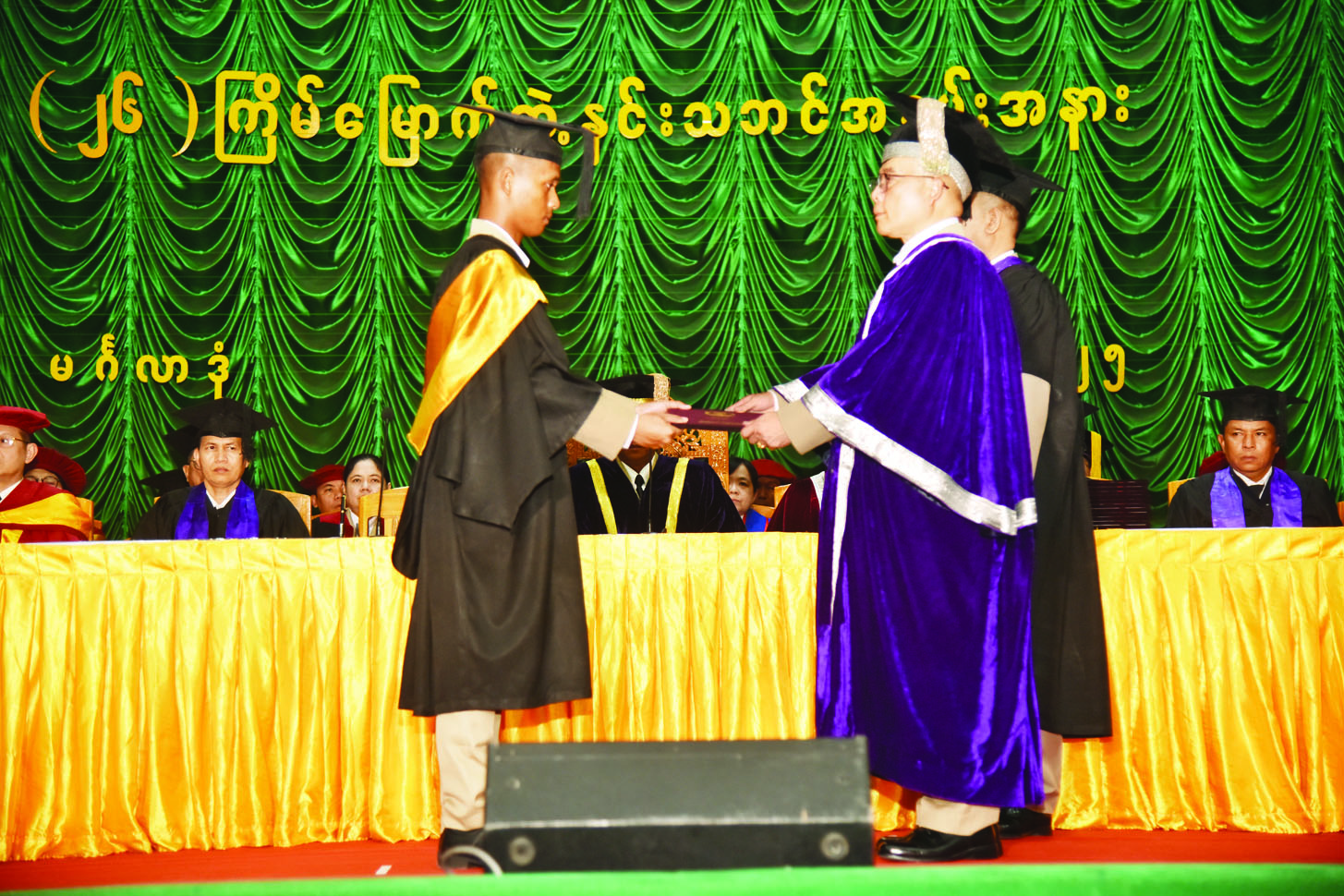 တပ်မတော်ဆေးတက္ကသိုလ်၏ (၂၆) ကြိမ်မြောက် ဘွဲ့နှင်းသဘင်အခမ်းအနားကို ယနေ့ မွန်းလွဲပိုင်းတွင် ရန်ကုန်တိုင်းဒေသကြီး မင်္ဂလာဒုံမြို့နယ်ရှိ တပ်မတော်ဆေးတက္ကသိုလ် ဘွဲ့နှင်းသဘင်ခန်းမ၌ ကျင်းပရာ တပ်မတော်ဆေးတက္ကသိုလ်ကျောင်းအုပ်ကြီး ဗိုလ်မှူးချုပ် စိုးညွန့်၊ တပ်မတော်ဆေးတက္ကသိုလ် ပါမောက္ခချုပ် ဗိုလ်မှူးချုပ် ခင်အောင်ထွန်းနှင့် တပ်မတော်ဆေးတက္ကသိုလ်မှ ပညာရေးအဖွဲ့ဝင်များ စုံညီစွာတက်ရောက်ကြသည်။