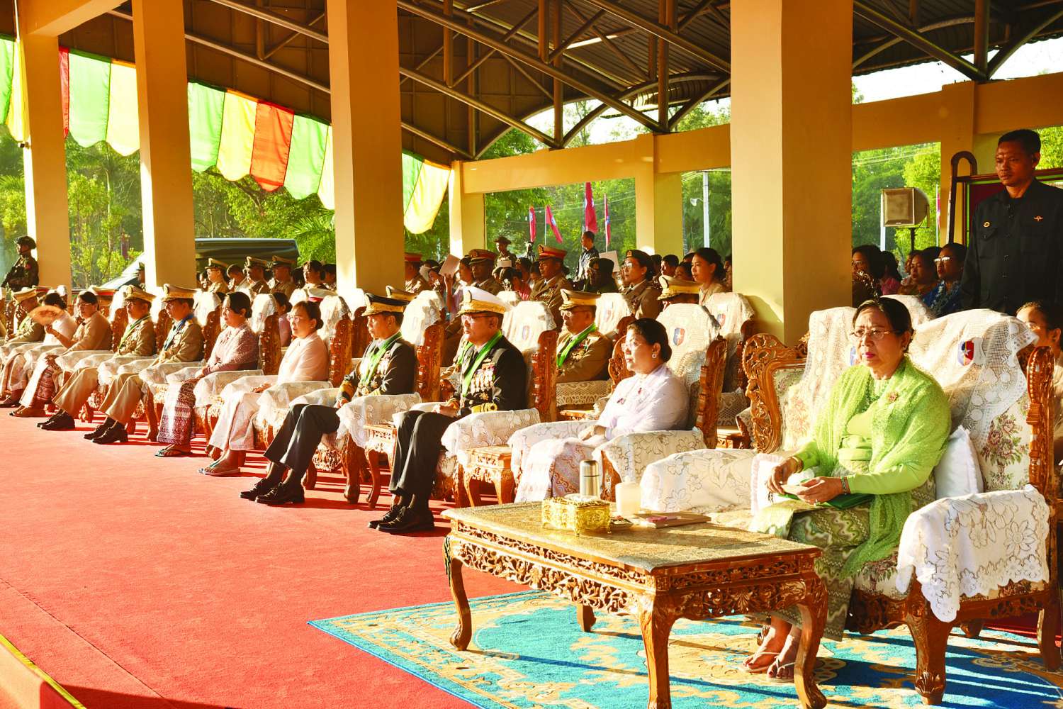 အဆိုပါ အခမ်းအနားသို့ နိုင်ငံတော်လုံခြုံရေးနှင့် အေးချမ်းသာယာရေးကော်မရှင်ဥက္ကဋ္ဌ တပ်မတော်ကာကွယ်ရေးဦးစီးချုပ်နှင့်အတူ ဇနီးဒေါ်ကြူကြူလှ၊ ကာကွယ်ရေးဦးစီးချုပ်(ရေ)ဗိုလ်ချုပ်ကြီး ဇေယျကျော်ထင် ထိန်ဝင်းနှင့်ဇနီး၊ ကာကွယ်ရေးဦးစီးချုပ်(လေ) ဗိုလ်ချုပ်ကြီးဇေယျကျော်ထင် စည်သူ ထွန်းအောင်နှင့်ဇနီး၊ ကာကွယ်ရေးဦးစီးချုပ်ရုံးမှ အဆင့်မြင့်တပ်မတော်အရာရှိကြီးများနှင့် ဇနီးများ၊ ပြည်ထောင်စုအဆင့်ပုဂ္ဂိုလ်များ၊ ပြည်ထောင်စုဝန်ကြီးများနှင့် ဇနီးများ၊ ရန်ကုန်တိုင်းစစ်ဌာနချုပ်တိုင်းမှူး၊ တပ်မတော်(ကြည်း) ဗိုလ်သင်တန်းကျောင်း(မှော်ဘီ) ခေတ္တကျောင်းအုပ်ကြီးနှင့် မှော်ဘီတပ်နယ်မှ တာဝန်ရှိသူများ၊ ကျောင်းဆင်းဗိုလ်လောင်းများ၏ မိဘဆွေမျိုးများနှင့် ဖိတ်ကြားထားသည့် ဧည့်သည်တော်များ တက်ရောက်ကြသည်။