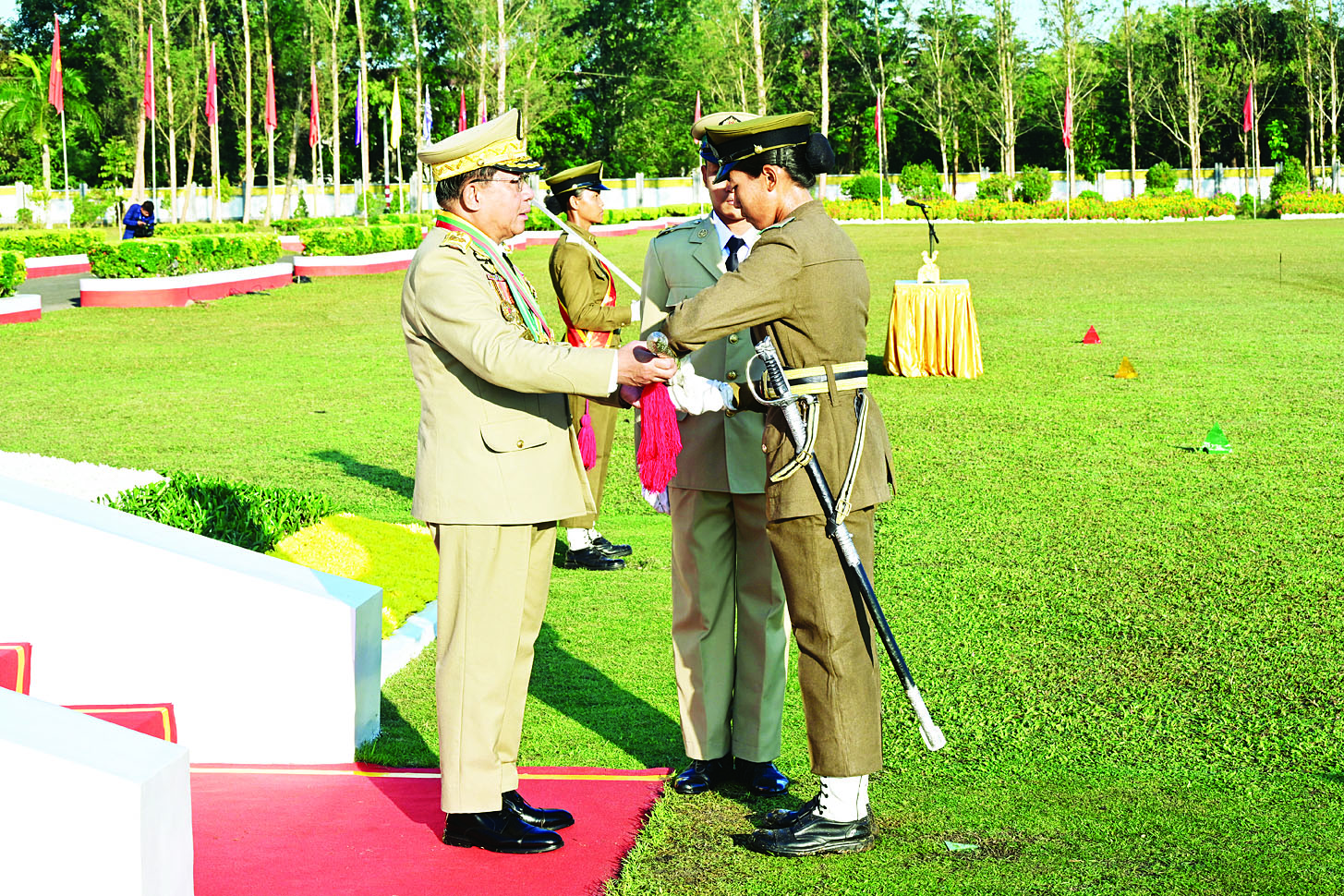 ယင်းနောက် နိုင်ငံတော်လုံခြုံရေးနှင့် အေးချမ်းသာယာရေးကော်မရှင်ဥက္ကဋ္ဌ တပ်မတော်ကာကွယ်ရေးဦးစီးချုပ် ဗိုလ်ချုပ်မှူးကြီး သတိုးမဟာသရေစည်သူ သတိုးသီရိသုဓမ္မ မင်းအောင်လှိုင်သည် ကျောင်းဆင်းဗိုလ်လောင်းတပ်ခွဲ၏ အလေးပြုခြင်းကို ခံယူပြီးနောက် စစ်ရေးပြအခမ်းအနားမှ ပြန်လည်ထွက်ခွာသည်။