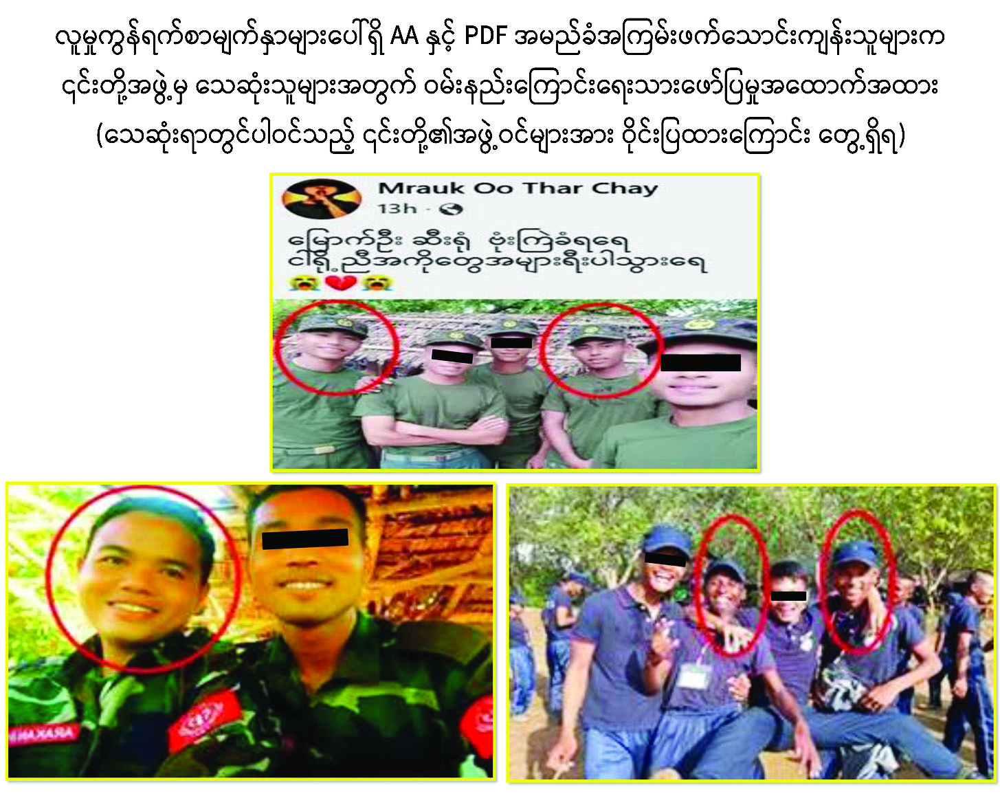 လူမှုကွန်ရက်စာမျက်နှာများပေါ်ရှိ ၎င်းအကြမ်းဖက်သောင်းကျန်းသူများ ရေးသားဖြန့်ဝေထားသည့် ဓာတ်ပုံအထောက်အထားများအရ ၎င်းတို့အဖွဲ့မှ ဒဏ်ရာရရှိသူများအား ဘေးလွတ်ရာသို့ ရွှေ့ပြောင်းပေးနေမှု၊ သေဆုံးသူများအတွက် ဝမ်းနည်းကြောင်း ရေးသားဖော်ပြမှုများကို တွေ့ရှိ ရပြီး အထက်ပါဖြစ်စဉ်တွင် သေဆုံး၊ ဒဏ်ရာရရှိ သူများမှာ ပြည်သူများမဟုတ်ဘဲ AA ၊ BPLA ၊ ဒေသခံ PDF၊ အရှိုချင်း စသည့် အကြမ်းဖက်သောင်းကျန်းသူများအနေဖြင့် စစ်စခန်းအဖြစ် အခြေပြုနေသောနေရာအတွင်း လိုအပ်သော အုပ်ချုပ်မှုကိစ္စရပ်များ ဆောင်ရွက်ရန်အတွက် ဒေသခံ AA အကြမ်းဖက်သောင်းကျန်းသူများ၏ ယုံကြည်စိတ်ချရသော မိသားစုဝင်များကို တာဝန် ပေးထားသူများအပြင် ၎င်းတို့ကိုထောက်ခံအားပေးသည့် အမာခံများသာဖြစ်သည်ဟု သိရှိရကြောင်းနှင့် တပ်မတော်အနေဖြင့် လိုအပ်သည့်အကြမ်းဖက် ချေမှုန်းရေးစစ်ဆင်ရေးကို (Rules of Engagement- ROE)နှင့်အညီ လိုအပ်သလို ဆက်လက်ဆောင်ရွက်သွားမည်ဖြစ်ကြောင်း သတင်းထုတ်ပြန်အပ်ပါသည်။