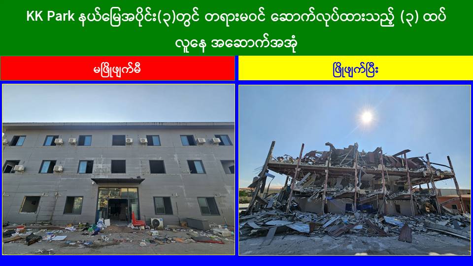 ထိုသို့ အွန်လိုင်းလိမ်လည်လောင်းကစားမှုတိုက်ဖျက်ရေးလုပ်ငန်းများ ဆောင်ရွက်လျက်ရှိရာ ယနေ့တွင် မြဝတီ-မဲထော်သလေး (KK Park) နယ်မြေအတွင်းရှိ အွန်လိုင်းလိမ်လည်လောင်းကစားမှုများကျူးလွန်ရာတွင် အသုံးပြုခဲ့သည့် အပိုင်း(၃)နယ်မြေအတွင်းရှိ တရားမဝင် ၃ ထပ်အဆောက်အအုံ ၅ လုံး၊ ၂ ထပ်အဆောက်အအုံ ၂ လုံးနှင့် ၁ ထပ်အဆောက်အအုံ ၃ လုံး၊ စုစုပေါင်း တရားမဝင်အဆောက်အအုံ ၁၀ လုံးကို ထပ်မံဖြိုချဖျက်ဆီးခဲ့သဖြင့် KK Park နယ်မြေအတွင်းရှိ တရားမဝင်အဆောက်အအုံ စုစုပေါင်း ၆၃၅ လုံး အနက် ၄၆၆ လုံးကို စနစ်တကျဖြိုချဖျက်ဆီးပြီးဖြစ်ကြောင်း သိရှိရသည်။