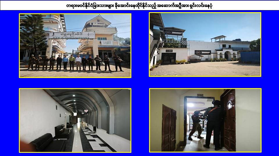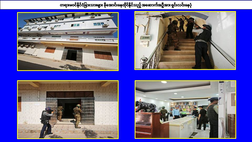 ထို့ပြင် ကရင်ပြည်နယ်၊ မြဝတီမြို့နှင့် ပတ်ဝန်းကျင်ဒေသတစ်ဝိုက်ရှိ အဆောက်အအုံများ၌ တရားမဝင်ပြည်ပနိုင်ငံသားများ ဝင်ရောက်နေထိုင်ခြင်းနှင့် အွန်လိုင်းလိမ်လည်လောင်းကစားမှုများ လုပ်ကိုင်ဆောင်ရွက်ခြင်းမရှိစေရေးအတွက် လုံခြုံရေးတပ်ဖွဲ့ဝင်များ၊ အုပ်ချုပ်ရေးအဖွဲ့အစည်းများနှင့် ဒေသတွင်းတာဝန်ရှိသူများအပါအဝင် အဖွဲ့စုံပါဝင်သည့် ပူးပေါင်းအဖွဲ့ဖြင့် ဒီဇင်ဘာ ၈ ရက်မှ စတင်၍ ရှာဖွေရှင်းလင်းဆောင်ရွက်ခဲ့ရာ ယနေ့တွင်လည်း တရားမဝင် ၄ ထပ်အဆောက်အအုံ ၁ လုံး၊ ၃ ထပ်အဆောက်အအုံ ၂ လုံး၊ ၂ ထပ်အဆောက်အအုံ ၁ လုံးနှင့် ၁ ထပ်အဆောက်အအုံ ၁ လုံး၊ စုစုပေါင်း တရားမဝင်အဆောက်အအုံ ၅ လုံးကို ထပ်မံစစ်ဆေးနိုင်ခဲ့သည်။