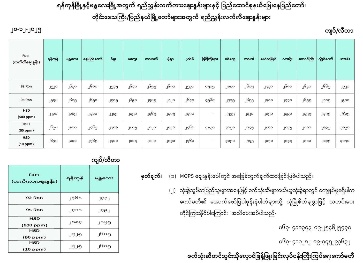 ရန်ကုန်မြို့နှင့် မန္တလေးမြို့အတွက် ရည်ညွှန်းလက်ကားဈေးနှုန်းများနှင့် ပြည်ထောင်စုနယ်မြေ နေပြည်တော်၊ တိုင်းဒေသကြီး/ပြည်နယ် မြို့တော်များအတွက် ရည်ညွှန်းလက်လီဈေးနှုန်းများ 12/20/2025
