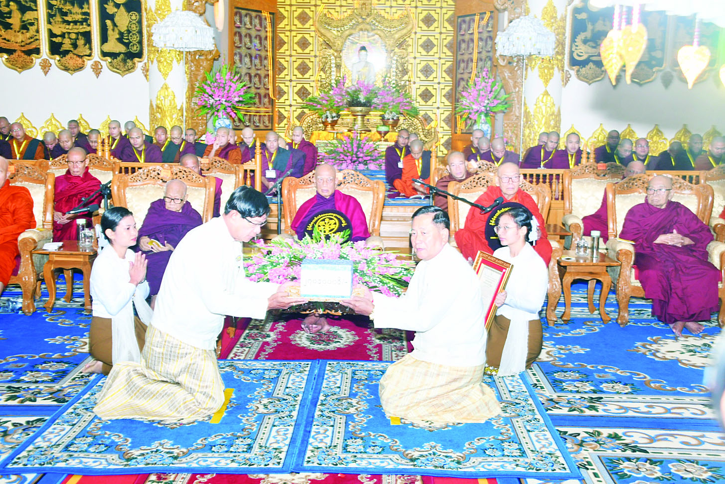 ဆက်လက်၍ နိုင်ငံတော်သံဃမဟာနာယက ဆရာတော်ကြီးများ၊ တိပိဋကဓရ တိပိဋကကောဝိဒ ရွေးချယ်ရေးအဖွဲ့ဩဝါဒါစရိယဆရာတော်ကြီးများ၊ ပုစ္ဆကဆရာတော်များ၊ ကြီးကြပ်ရေးဆရာတော်များ၊ စာထောက်စာမဆရာတော်များ၊ တိပိဋကဓရ တိပိဋကကောဝိဒရွေးချယ်ရေးစာမေးပွဲ ဝင်ရောက်ဖြေဆိုကြမည့် သံဃာတော်များအား အလှူရှင်များက အလှူငွေကျပ် ၁၂၅၂၅၃၀၀၀ ကို ပေးအပ်လှူဒါန်းရာ တိုင်းဒေသကြီးဝန်ကြီးချုပ်၊ ဒုတိယဝန်ကြီးနှင့် တာဝန်ရှိသူများကလက်ခံရယူ၍ ဂုဏ်ပြုမှတ်တမ်းလွှာများ ပြန်လည်ပေးအပ်ကြသည်။