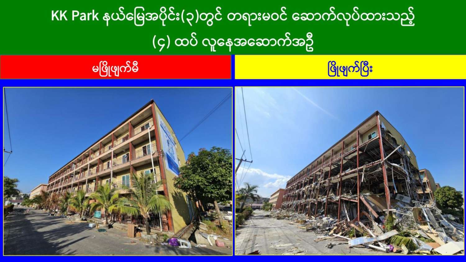 ထိုသို့ အွန်လိုင်းလိမ်လည်လောင်းကစားမှုတိုက်ဖျက်ရေး လုပ်ငန်းများဆောင်ရွက်လျက်ရှိရာ ယနေ့တွင် မြဝတီ-မဲထော်သလေး (KK Park) နယ်မြေအတွင်းရှိ အွန်လိုင်းလိမ်လည်လောင်းကစားမှုများကျူးလွန်ရာတွင် အသုံးပြုခဲ့သည့် အပိုင်း (၃) နယ်မြေအတွင်းရှိ တရားမဝင် ၄ ထပ်အဆောက်အအုံ ၃ လုံးကို ထပ်မံဖြိုချဖျက်ဆီးခဲ့သဖြင့် KK Park နယ်မြေအတွင်းရှိ တရားမဝင်အဆောက်အအုံစုစုပေါင်း ၆၃၅ လုံးအနက် ၄၉၄ လုံးကို စနစ်တကျ ဖြိုချဖျက်ဆီးပြီးဖြစ်ကြောင်း သိရှိရသည်။ အဆိုပါ KK Park နယ်မြေအတွင်းရှိ အဆောက်အအုံများအနက် ယာဉ်ယန္တရားများအသုံးပြု၍ ဖြိုချဖျက်ဆီးခြင်းများ ဆောင်ရွက်ပြီးစီးခဲ့သည့် တရားမဝင်အဆောက်အအုံများကို အလုံးစုံပျက်စီးစေရန်အတွက် လေအိုးမီးအိုးဖြင့် ထပ်မံဖျက်ဆီးခြင်းများကိုလည်း ဒီဇင်ဘာ ၁၄ ရက်မှ စတင်ဆောင်ရွက်ခဲ့ရာ ယနေ့တွင် ၂ ထပ်အဆောက်အအုံ ၅ လုံးကို ထပ်မံဖျက်ဆီးနိုင်ခဲ့သဖြင့် စုစုပေါင်း ၂ ထပ် အဆောက်အအုံ ၄၆ လုံးကို ရာခိုင်နှုန်းပြည့်ဖျက်ဆီးပြီးဖြစ်ကြောင်း သိရှိရသည်။