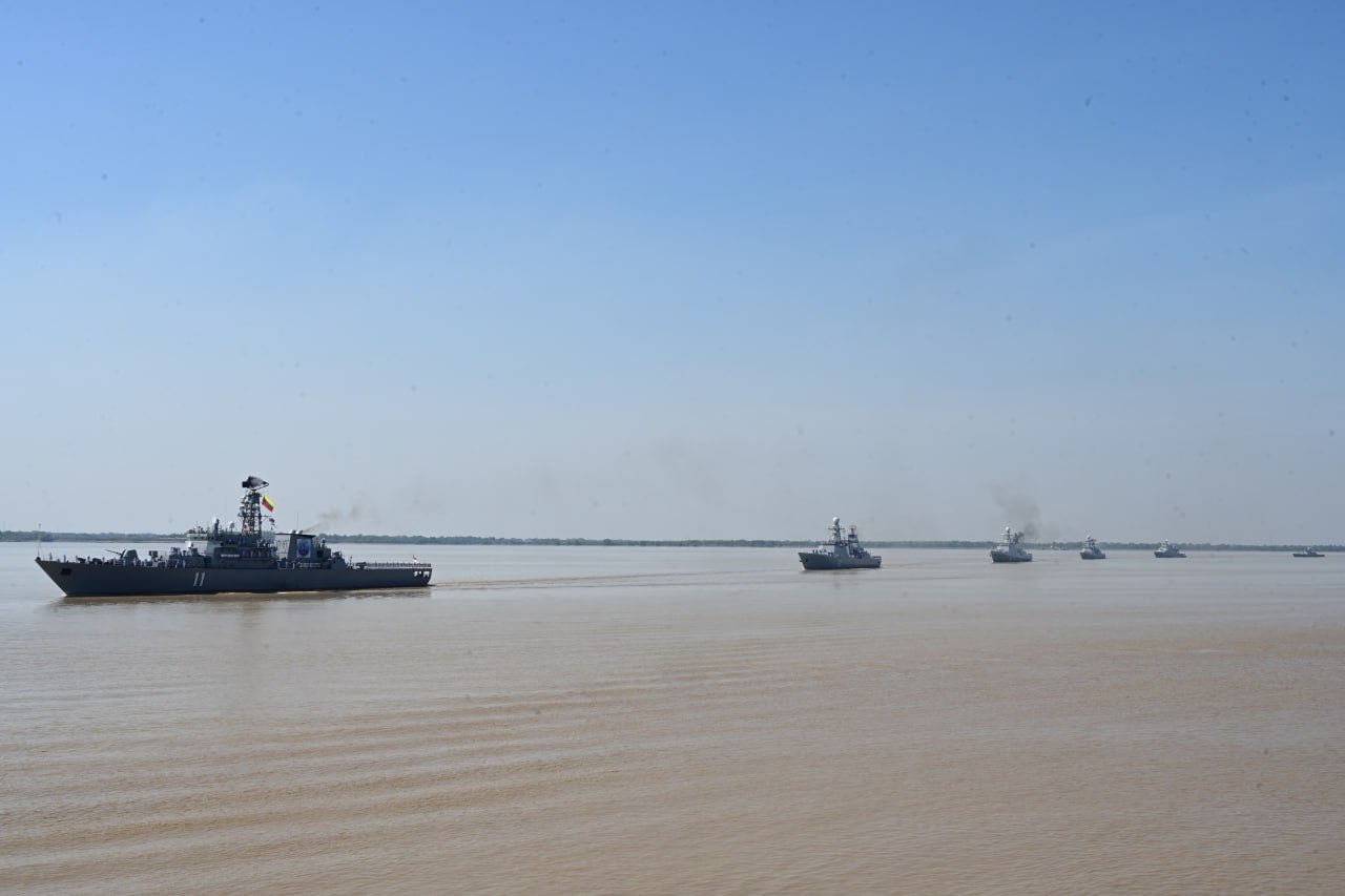 ဆက်လက်ပြီး နိုင်ငံတော်လုံခြုံရေးနှင့် အေးချမ်းသာယာရေးကော်မရှင်ဥက္ကဋ္ဌ တပ်မတော်ကာကွယ်ရေးဦးစီးချုပ်သည် စစ်ရေယာဉ် (မုတ္တမ) ပေါ်ရှိ အလေးပြုခံစင်မြင့်မှနေ၍ ဂုဏ်ပြုတပ်ဖွဲ့၏ အလေးပြုခြင်းကိုခံယူပြီး ဂုဏ်ပြုတပ်ဖွဲ့ကိုစစ်ဆေးသည်။ ဂုဏ်ပြုတပ်ဖွဲ့၏ အလေးပြုခြင်းကိုခံယူနေစဉ် စစ်ရေယာဉ် (ရန်တိုင်းအောင်) နှင့် စစ်ရေယာဉ် (ရန်ကြီးအောင်) တို့မှ အမြောက် (၂၁) ချက်ပစ်ဖောက်ပြီး နိုင်ငံတော်လုံခြုံရေးနှင့် အေးချမ်းသာယာရေးကော်မရှင်ဥက္ကဋ္ဌ တပ်မတော်ကာကွယ်ရေးဦးစီးချုပ်အား ဂုဏ်ပြုအလေးပြုကြသည်။ ၎င်းနောက် နိုင်ငံတော်လုံခြုံရေးနှင့် အေးချမ်းသာယာရေးကော်မရှင်ဥက္ကဋ္ဌ တပ်မတော်ကာကွယ်ရေးဦးစီးချုပ်အား ရေငုတ်သင်္ဘောစစ်ရေယာဉ် (မင်းရဲကျော်ထင်) ဖရီဂိတ်စစ်ရေယာဉ် (အောင်ဇေယျ) ဦးဆောင်သော ဖရီဂိတ်စစ်ရေယာဉ် (ကျန်စစ်သား)၊ ဖရီဂိတ်စစ်ရေယာဉ် (ဆင်ဖြူရှင်)၊ ကော်ဗက်စစ်ရေယာဉ် (တပင်ရွှေထီး)၊ ကမ်းလွန်ကင်းလှည့်ရေယာဉ် (အင်းလေး)၊ ရေငုပ်သင်္ဘောတိုက်ဖျက်ရေးရေယာဉ် (ရန်ငြိမ်းအောင်) နှင့် ရေငုပ်သင်္ဘောတိုက်ဖျက်ရေးရေယာဉ် (ရန်ရဲအောင်)၊ အမြန်သွားတိုက်ခိုက်ရေးရေယာဉ် (ဒုံးပျံ) စစ်ရေယာဉ် (၄၉၁)၊ အမြန်သွားတိုက်ခိုက်ရေးရေယာဉ် (ဒုံးပျံ) စစ်ရေယာဉ် (၄၉၂) တို့က Single Line Formation ပုံစံဖြင့်လည်းကောင်း၊ အမြန်သွားတိုက်ခိုက်ရေးယာဉ်စစ်ရေယာဉ် (၅၆၄)၊ (၅၆၆)၊ (၅၅၆)၊ (၅၅၈)၊ ကမ်းခြေစောင့်တိုက်ခိုက်ရေးရေ ရေယာဉ်စစ်ရေယာဉ် (၄၂၇)၊ (၄၂၈)၊ အမြန်သွားကင်းလှည့်ရေယာဉ်စစ်ရေယာဉ် (၂၇၁)၊ (၂၇၂)၊ (၂၇၆)၊ (၂၇၈) တို့က Line Abreast Formation ပုံပြုပုံစံများဖြင့် အသီးသီးပုံပြု မောင်းနှင်ပြီး နိုင်ငံတော်လုံခြုံရေးနှင့် အေးချမ်းသာယာရေးကော်မရှင်ဥက္ကဋ္ဌ တပ်မတော်ကာကွယ်ရေးဦးစီးချုပ်အား ချီတက်အလေးပြုကြသည်။