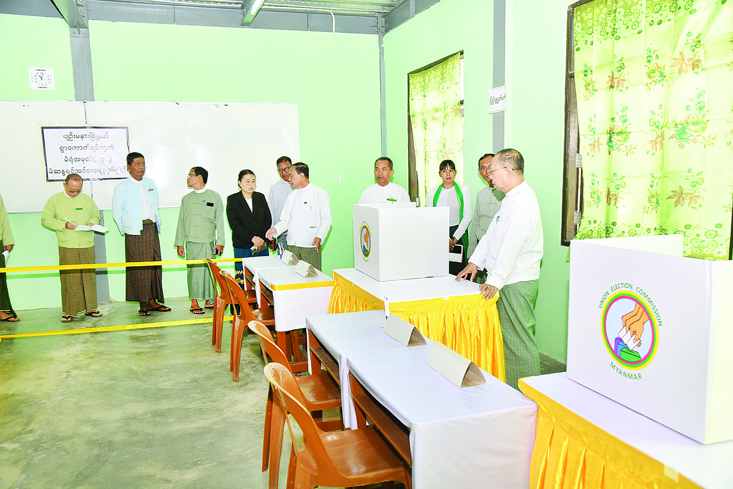 ပြည်ထောင်စုရွေးကောက်ပွဲကော်မရှင်ဥက္ကဋ္ဌနှင့် အဖွဲ့သည် ပုဗ္ဗသီရိမြို့နယ်၊ ပျဉ်းမနားမြို့နယ်နှင့် ဇမ္ဗူသီရိမြို့နယ်တို့၌ မဲရုံများဖွင့်လှစ်ထားရှိမှုကို ကြည့်ရှုစစ်ဆေးရာ မဲရုံတာဝန်ရှိသူများက ရွေးကောက်ပွဲ အောင်မြင်စွာကျင်းပနိုင်ရေးအတွက် မဲရုံများ၌ ပြင်ဆင်ဆောင်ရွက်ထားရှိမှု အခြေအနေများကို ရှင်းလင်းတင်ပြကြသည်။