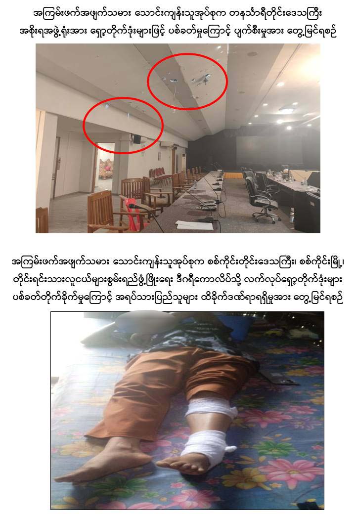 ထို့သို့လုပ်ဆောင်ခဲ့ကြရာ အကြမ်းဖက်အဖျက်သမားသောင်းကျန်းသူအုပ်စုများအနေဖြင့် ပါတီစုံဒီမိုကရေစီအထွေထွေရွေးကောက်ပွဲအပိုင်း (၁) ကျင်းပခဲ့သည့် ဒီဇင်ဘာ ၂၈ ရက်နေ့၌ ကချင်ပြည်နယ်၊ မြစ်ကြီးနားမြို့၊ ရွှေညောင်ပင်ရပ်ကွက်၊ အမှတ် (၁၁) အခြေခံ ပညာအထက်တန်းကျောင်းရှိ မဲရုံအမှတ် (၈၂) ၌ လက်လုပ်အသံမိုင်းဖောက်ခွဲခြင်း၊ ကယားပြည်နယ်၊ လွိုင်ကော်မြို့၊ ရွှေတောင်ရပ်ကွက်နှင့် မင်္ဂလာရပ်ကွက်အတွင်းသို့ ၁၀၇ မမ လက်လုပ်ဗုံးသီးများဖြင့် ပစ်ခတ်တိုက်ခိုက်ခြင်း၊ ကရင်ပြည်နယ်၊ မြဝတီမြို့၊ အမှတ် (၃) ရပ်ကွက်ရှိ ကမ္ဘောဇဘဏ်အနီးနှင့် အမှတ် (၅) ရပ်ကွက်ရှိ မြန်မာ-ထိုင်း ချစ်ကြည်ရေး အမှတ် (၂) တံတားအနီးတို့၌ ဒေသန္တရလက်လုပ်မိုင်းများ ဖောက်ခွဲခြင်း၊ တနင်္သာရီတိုင်းဒေသကြီးအစိုးရအဖွဲ့ရုံးအား Fixed Wing ဖြင့် ပစ်ခတ်ခြင်း၊ ခမောက်ကြီးမြို့၊ အောင်ချမ်းသာကျေးရွာအုပ်စု၊ ယုဇနဆီအုန်းကုမ္ပဏီ၊ မာရမ်းပျိုးခြံမှ ဆန္ဒမဲပေးရန် မဲရုံသို့ သွားရောက်သည့် ဆီအုန်းခြံလုပ်သား ၁၇၀ ဦးအား တားဆီးခြင်း၊ စစ်ကိုင်းတိုင်းဒေသကြီး၊ ရွှေဘိုမြို့၊ အမှတ် (၃) ရပ်ကွက်ရှိ မဲရုံအမှတ် (၂) အနီးသို့ Drop Bomb ချတိုက်ခိုက်ခြင်း၊ စစ်ကိုင်းမြို့၊ တိုင်းရင်းသားလူငယ်များစွမ်းရည်ဖွံ့ဖြိုးရေးဒီဂရီကောလိပ်သို့ လက်လုပ်ရှော့တိုက်ဒုံး (၆) လုံးဖြင့် ပစ်ခတ်တိုက်ခိုက်ခြင်း၊ တမူးမြို့၊ စော်ဘွား (၁) ရပ်ကွက်၊ အမှတ် (၂) အခြေခံပညာအထက်တန်းကျောင်းရှိ မဲရုံအမှတ် (၃) အနီးသို့ Drop Bomb ချတိုက်ခိုက်ခြင်း၊ ကသာမြို့မြောက်ဖက်နှင့် တောင်ဖက်မှ လက်နက်ငယ်၊ လက်နက်ကြီးများဖြင့် နှောင့်ယှက်ပစ်ခတ်ခြင်း၊ မန္တလေးတိုင်းဒေသကြီး၊ မတ္တရာမြို့နယ်၊ နန်းတော်ကျွန်းကျေးရွာအတွင်းနှင့် အောင်မြေသာဇံမြို့နယ်အတွင်းတို့သို့ ၁၀၇ မမ ရှော့တိုက်ဒုံးများဖြင့် ပစ်ခတ်တိုက်ခိုက်ခြင်း၊ မြင်းခြံမြို့ ထွေ/အုပ်ရုံးအနီး၊ တရားရုံးအနီးနှင့် ဗဟိုအကျဉ်းထောင်ကြားလမ်းအနီးတို့သို့ Drop Bomb ချတိုက်ခိုက်ခြင်း၊ ညောင်ဦးမြို့နယ်၊ ဇုန်အမှတ် (၉)၊ မဲရုံအမှတ် (၆၄)၊ အခြေခံ ပညာမူလတန်းကျောင်း (ပြွန်) စာသင်ကျောင်းအနီးသို့ လက်နက်ငယ်များဖြင့် လာရောက်နှောက်ယှက်ပစ်ခတ်တိုက်ခိုက်ခြင်းစသည့် အကြမ်းဖက်အဖျက်အမှောင့်လုပ်ရပ်များကို ဒီဇင်ဘာလ ၂၇ ရက်နေ့ ညနေမှ ၂၈ ရက်နေ့ ညနေပိုင်းအထိ အပိုင်း (၁) မဲဆန္ဒနယ် (၁၀၂) မြို့နယ်အနက် မြို့နယ် (၁၁) ခုတို့၌ နှောင့်ယှက်မှုများ ပြုလုပ်ခဲ့ကြရာ ပြည်သူ ၅ ဦးခန့်သာ အနည်းငယ်ထိခိုက်ဒဏ်ရာရမှုဖြစ်ပွားခဲ့သော်လည်း လွတ်လပ်၍ တရားမျှတပြီး ဂုဏ်သိက္ခာရှိသည့် ပါတီစုံဒီမိုကရေစီအထွေထွေရွေးကောက်ပွဲသို့ နှောင့်ယှက်ပစ်ခတ်မှုနှင့် ခြိမ်းခြောက်မှုများကြားမှ အပိုင်း (၁) ကျင်းပသည့် (၁၀၂) မြို့နယ်