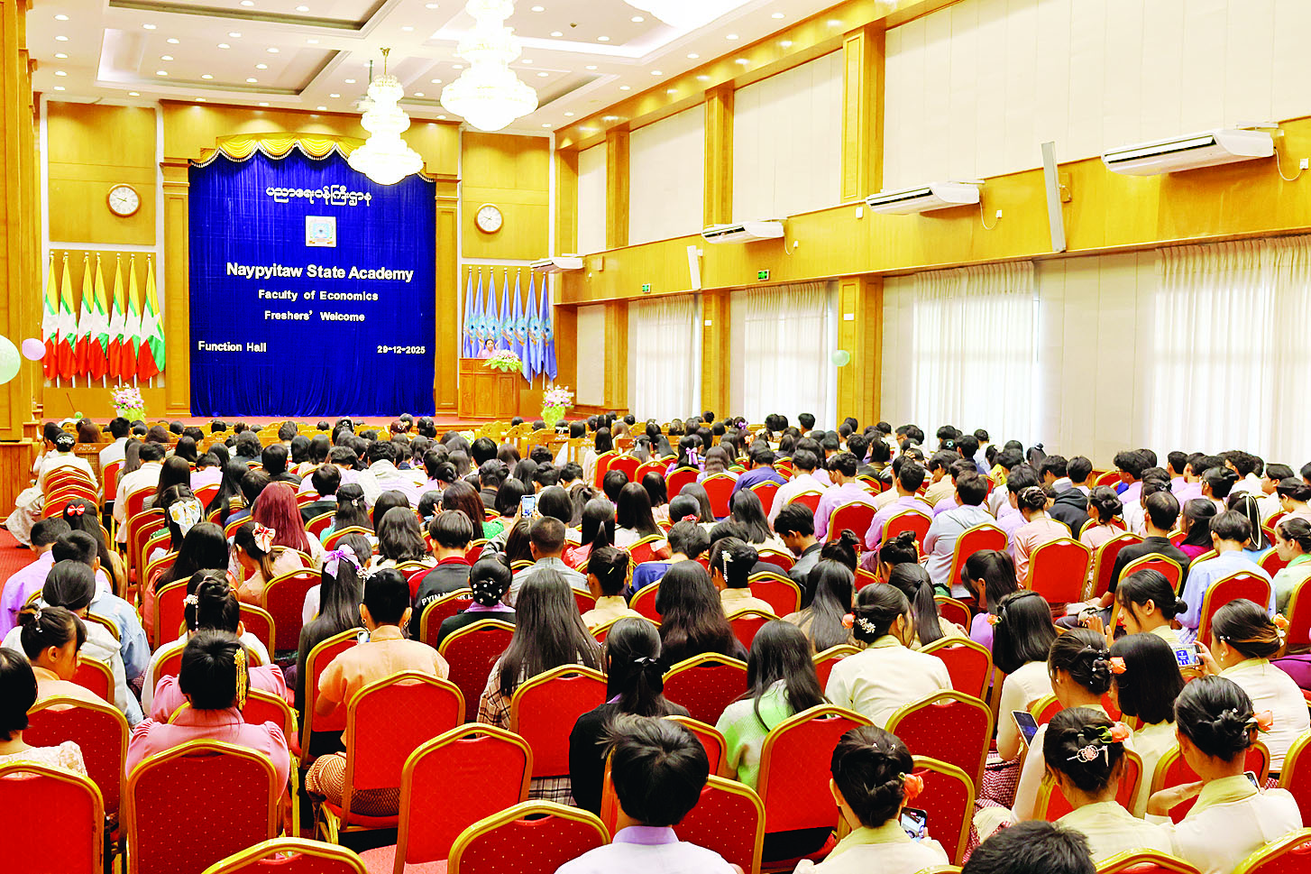 Naypyitaw State Academy၊ စီးပွားရေးပညာ မဟာဌာန၏ ၂၀၂၅ - ၂၀၂၆ ပညာသင်နှစ် မောင်မယ်သစ်လွင်ကြိုဆိုပွဲအခမ်းအနားကို အဆိုပါတက္ကသိုလ်ရှိ ဘက်စုံသုံးခန်းမ၌ ဒီဇင်ဘာ ၂၉ ရက်က နှစ်ပိုင်းခွဲ၍ ကျင်းပရာ Naypyitaw State Academy ပါမောက္ခချုပ်၊ ဒုတိယပါမောက္ခချုပ်၊ ပါမောက္ခ (ဌာနမှူး) များ၊ ဆရာ ဆရာမများ၊ သင်တန်း၊ စီမံမှတာဝန်ရှိသူများ၊ ဝါဏိဇ္ဇဗေဒ၊ စီးပွားရေးလုပ်ငန်းစီမံခန့်ခွဲမှု ပညာ၊ စာရင်းအင်းပညာ၊ ဘောဂဗေဒ၊ ခရီးသွားလုပ်ငန်းနှင့် ဧည့်ဝန်ဆောင်မှုစီမံခန့်ခွဲမှုပညာနှင့် စီးပွားရေးပညာအထူးပြု ကျောင်းသား ကျောင်းသူများ တက်ရောက်ကြသည်။