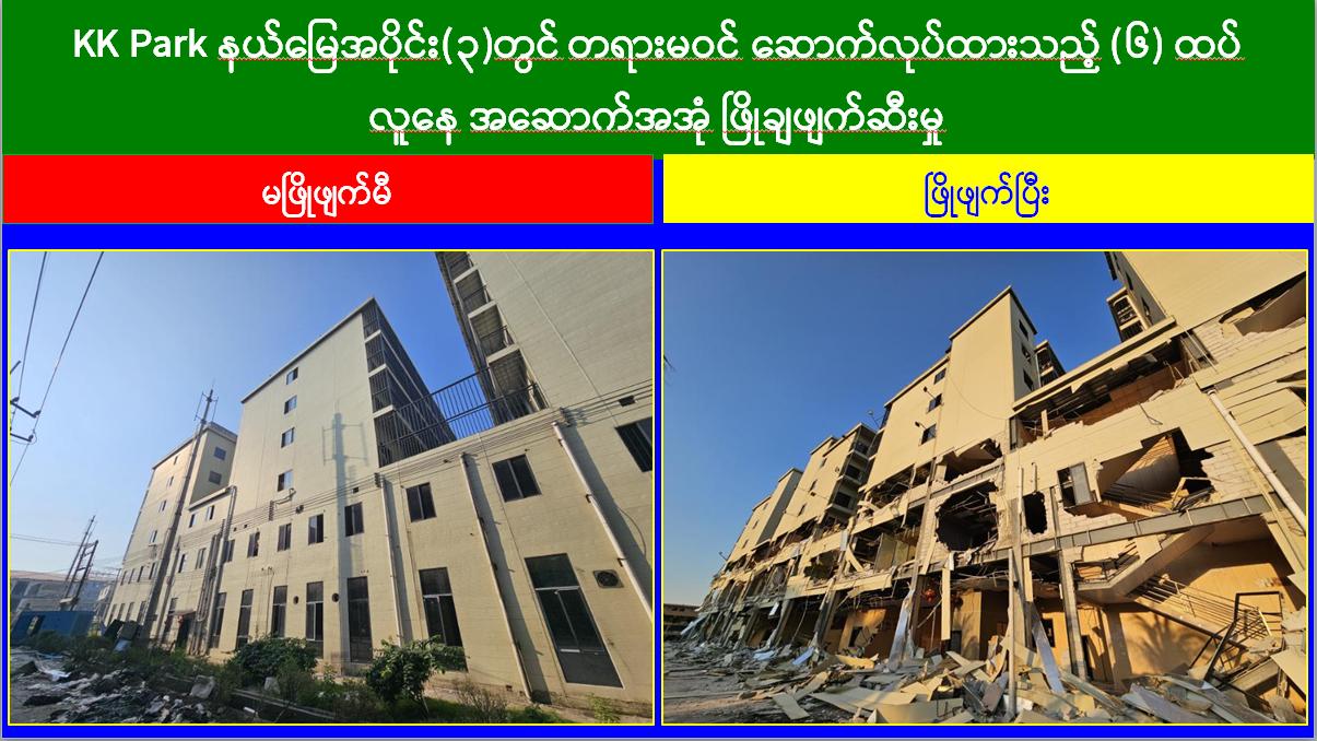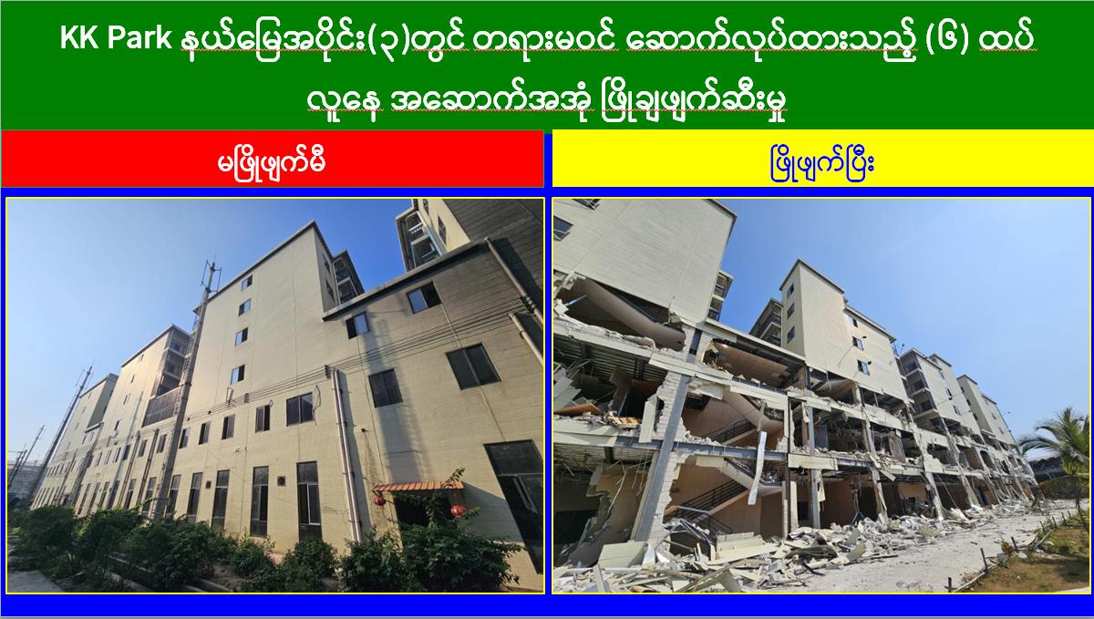 မြန်မာနိုင်ငံအစိုးရအနေဖြင့် အွန်လိုင်းလိမ်လည်လောင်းကစားမှုများ အများဆုံးအခြေချလုပ်ကိုင်လျက်ရှိကြသည့် ရွှေကုက္ကိုလ်နယ်မြေနှင့် KK Park နယ်မြေများရှိ တရားမဝင် အဆောက်အအုံများအတွင်း ဝင်ရောက်ရှင်းလင်း၍ အွန်လိုင်းလိမ်လည်လောင်းကစားမှုလုပ်ငန်းစဉ်များတွင် အသုံးပြုခဲ့သည့် သိမ်းဆည်းရမိပစ္စည်းများအား စနစ်တကျ ဖျက်ဆီးခြင်းနှင့် တရားမဝင်အဆောက်အအုံများအား စနစ်တကျဖြိုချဖျက်ဆီးခြင်းများကို အဖွဲ့စုံပါဝင်သည့် ပူးပေါင်းအဖွဲ့ဖြင့် ဆောင်ရွက်လျက်ရှိရာ ယနေ့တွင်လည်း KK Park နယ်မြေအတွင်းရှိ တရားမဝင်အဆောက်အအုံ ၆ လုံးကို ထပ်မံဖြိုချဖျက်ဆီးခဲ့ကြောင်း သိရှိရသည်။