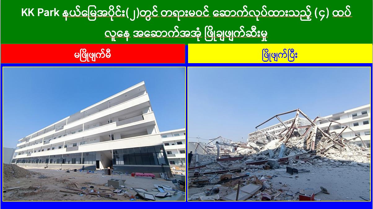 မြဝတီ-မဲထော်သလေး ယနေ့တွင် (KK Park) အပိုင်း (၃) နယ်မြေအတွင်းရှိ အွန်လိုင်းလိမ်လည်လောင်းကစားမှုများ ကျူးလွန်ရာတွင် အသုံးပြုခဲ့သည့် တရားမဝင် ၆ ထပ် အဆောက်အအုံ ၄ လုံးနှင့် အပိုင်း (၂) နယ်မြေအတွင်းရှိ အွန်လိုင်းလိမ်လည်လောင်းကစားမှုများ ကျူးလွန်ရာတွင် အသုံးပြုခဲ့သည့် တရားမဝင် ၄ ထပ် အဆောက်အအုံ ၂ လုံး၊ စုစုပေါင်း တရားမဝင် အဆောက်အအုံ ၆ လုံးတို့ကို ထပ်မံဖြိုချဖျက်ဆီးခဲ့သဖြင့် KK Park နယ်မြေအတွင်းရှိ တရားမဝင်အဆောက်အအုံ စုစုပေါင်း ၆၃၅ လုံး အနက် ၅၅၅ လုံးကို စနစ်တကျ ဖြိုချဖျက်ဆီးပြီးဖြစ်ကြောင်း သိရှိရသည်။