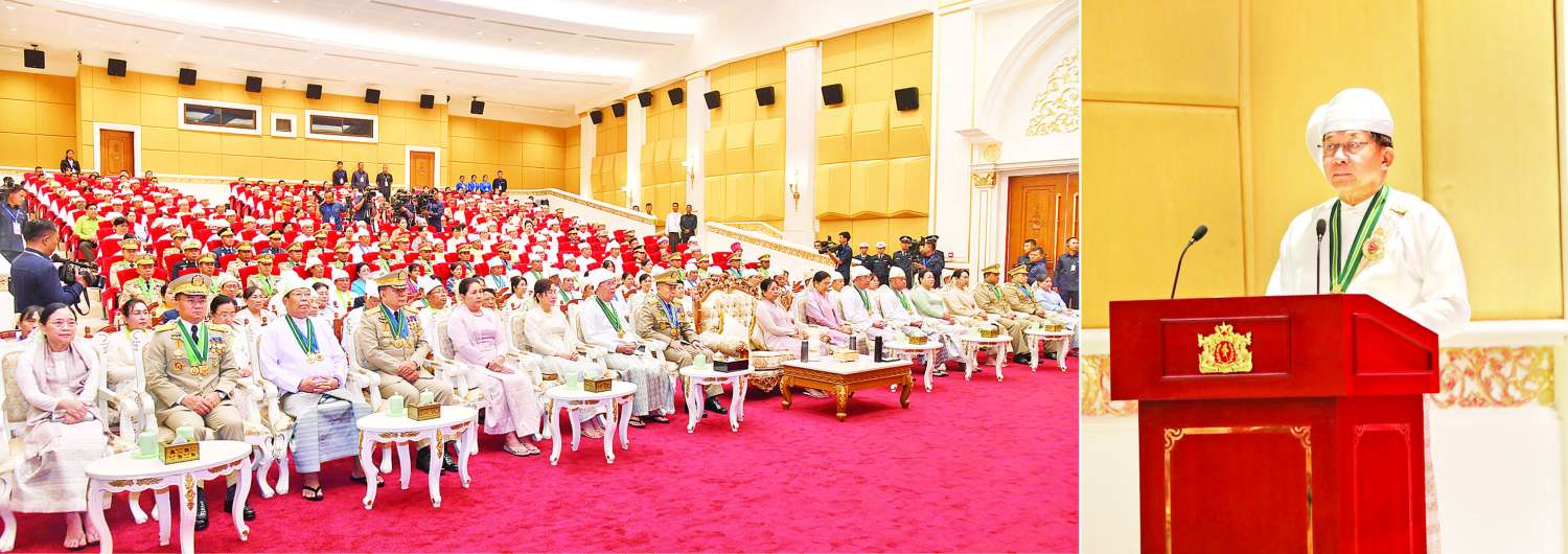 သို့သော်လည်း နိုင်ငံနှင့်ပြည်သူကောင်းရာကောင်းကျိုးကို မလိုလားသည့် ပြည်ပနိုင်ငံတချို့နှင့် စဉ်းစားတွေးခေါ်မှုနည်းပါးပြီး လမ်းမှားလိုက်နေကြသည့် ပြည်တွင်းလက်နက်ကိုင်အဖွဲ့အစည်းတချို့၊ အသိဉာဏ်နည်းပါးသည့် အကြမ်းဖက်သမားများနှင့် အားပေးထောက်ခံသူများကြောင့် ယခုအချိန်တွင် အောင်မြင်သင့်သလောက် မအောင်မြင်သည်ကိုလည်း အားလုံးအသိပင်ဖြစ်ကြောင်း၊ ယနေ့ဘွဲ့ခံပုဂ္ဂိုလ်များထဲတွင်ပါသည့် နိုင်ငံတည်ငြိမ်အေးချမ်းရေးအတွက် သက်စွန့်ကြိုးပမ်းဆောင်ရွက်နေသူများ၊ အသိပညာ အတတ်ပညာနှင့် နိုင်ငံကိုဘက်ပေါင်းစုံက တိုးတက်အောင် ဆောင်ရွက်နေကြသူများရှိသလို ပြည်တွင်းပြည်ပ၏ အဖျက်အမှောင့်ပယောဂကိုယုံစားပြီး အသိပညာနည်းပါးသည့် ကိုယ်ကျိုးအတ္တသမားများ၊ နိုင်ငံတော်အပေါ် သစ္စာဖောက်ဖျက်သူများလည်း ရှိနေဆဲဖြစ်ကြောင်း၊ ထိုသို့ဆောင်ရွက်နေမှုများအပေါ် မိမိတို့အနေဖြင့်စိတ်မပျက် လက်မလျှော့ဘဲ အားလုံးက စုစုစည်းစည်း၊ ညီညီညွတ်ညွတ်ဖြင့်ပူးပေါင်းပြီးကောင်းမွန်သည့် နိုင်ငံ၏အနာဂတ်ကို အောင်မြင်အောင် ဖော်ဆောင်ပေးကြရန် တိုက်တွန်းမှာကြားလိုကြောင်း။