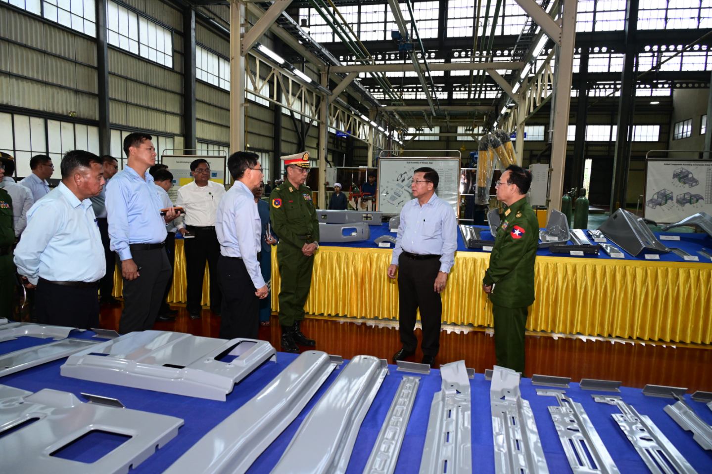 ယင်းနောက် နိုင်ငံတော်လုံခြုံရေးနှင့် အေးချမ်းသာယာရေးကော်မရှင်ဥက္ကဋ္ဌ တပ်မတော်ကာကွယ်ရေးဦးစီးချုပ်နှင့် အဖွဲ့ဝင်များသည် စက်ရုံအတွင်းရှိ အလုပ်ရုံများအတွင်း မော်တော်ယာဉ်များထုတ်လုပ်နေမှု လုပ်ငန်းစဉ်အဆင့်ဆင့်၊ ထုတ်လုပ်ပြီး မော်တော်ယာဉ်များအား စစ်ဆေးစမ်းသပ်နေမှုနှင့် ထုတ်လုပ်ထားရှိသည့် မော်တော်ယာဉ်များအား လိုက်လံကြည့်ရှုစစ်ဆေးခဲ့ပြီး တာဝန်ရှိသူများ၏ တင်ပြချက်များအပေါ် လိုအပ်သည်များ လမ်းညွှန်မှာကြား ဖြည့်ဆည်းဆောင်ရွက်ပေးခဲ့သည်။