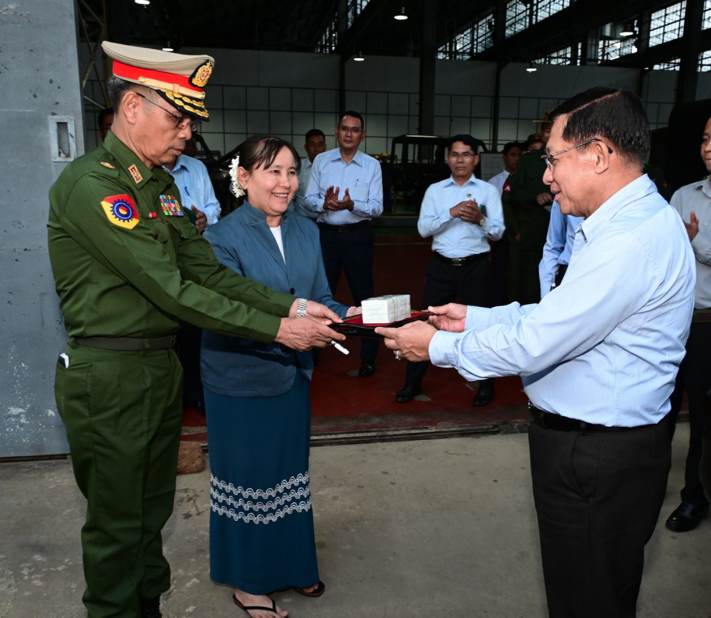 ယင်းနောက် နိုင်ငံတော်လုံခြုံရေးနှင့်အေးချမ်းသာယာရေးကော်မရှင်ဥက္ကဋ္ဌ တပ်မတော်ကာကွယ်ရေးဦးစီးချုပ်က စက်ရုံဝန်ထမ်းများအတွက် ချီးမြှင့်ငွေများကိုပေးအပ်ရာ စက်ရုံမှူးက လက်ခံရယူခဲ့ကြောင်း သတင်းရရှိသည်။