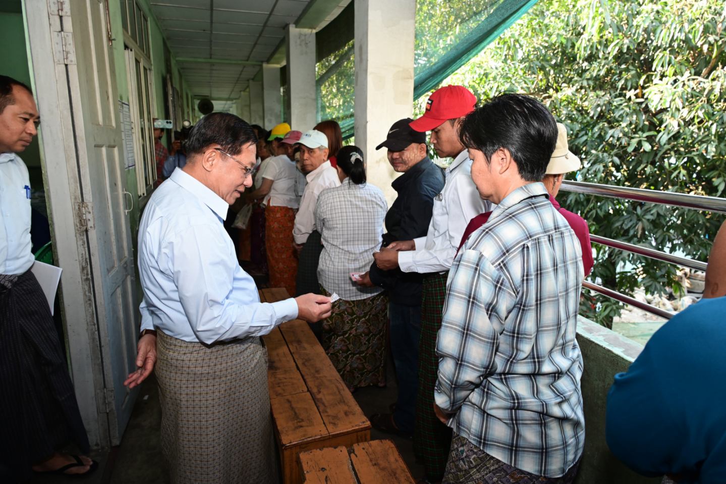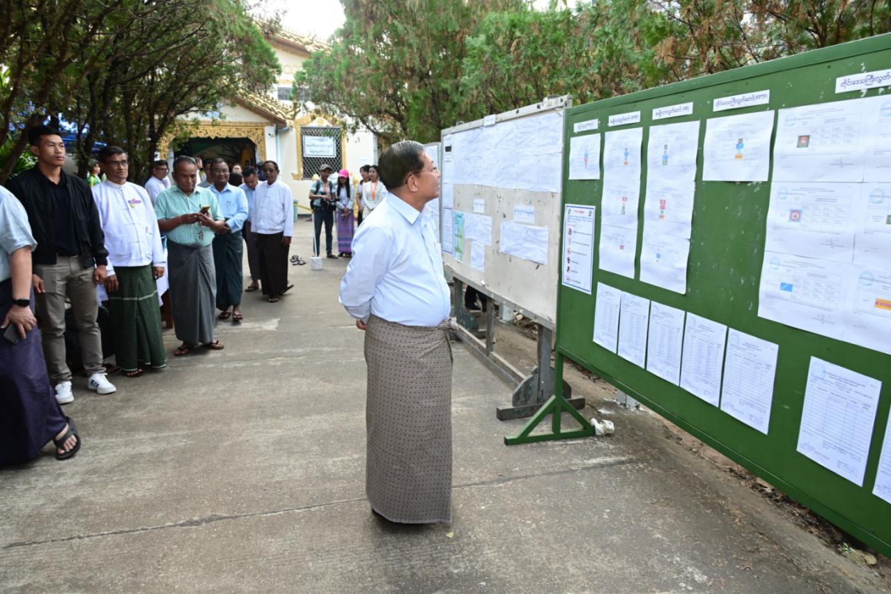 ​​​​​​​နိုင်ငံတော်ယာယီသမ္မတ နိုင်ငံတော်လုံခြုံရေးနှင့် အေးချမ်းသာယာရေးကော်မရှင်ဥက္ကဋ္ဌ ဗိုလ်ချုပ်မှူးကြီးမင်းအောင်လှိုင် ပြည်ထောင်စုသမ္မတမြန်မာနိုင်ငံတော် ၂၀၂၅ ခုနှစ် ပါတီစုံဒီမိုကရေစီအထွေထွေရွေးကောက်ပွဲ အပိုင်း(၂)တွင် ပါဝင်ဆန္ဒမဲပေးနေကြသည့် မဲဆန္ဒရှင်ပြည်သူများအား မဲရုံများအလိုက် လိုက်လံကြည့်ရှုအားပေး