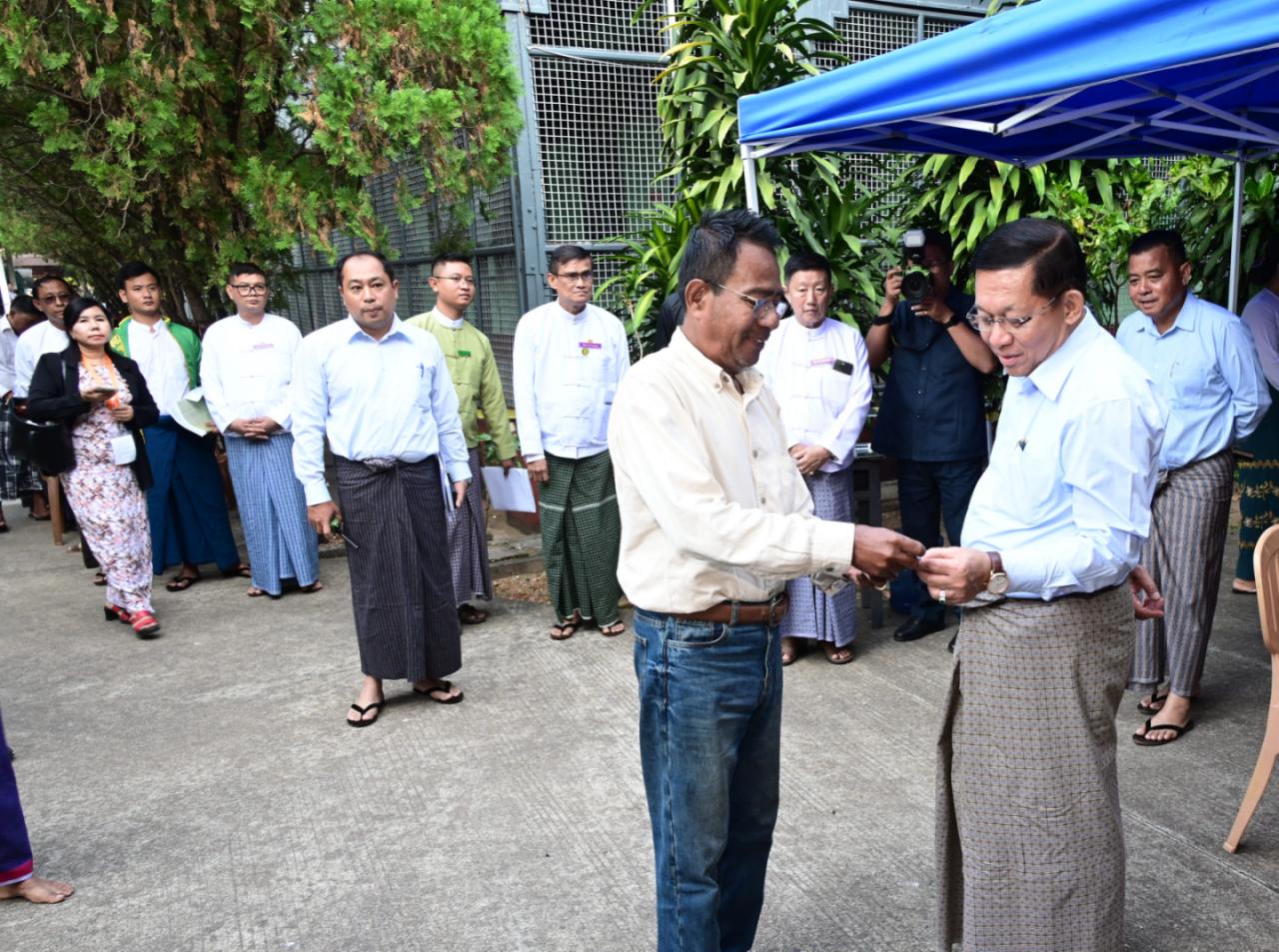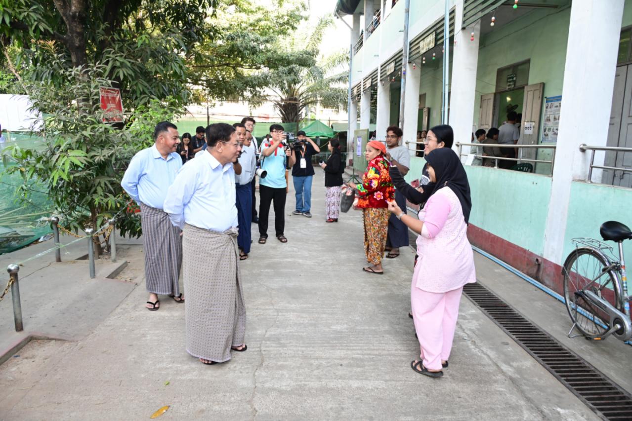 ထိုသို့ကြည့်ရှုအားပေးရာတွင် နိုင်ငံတော်ယာယီသမ္မတ နိုင်ငံတော်လုံခြုံရေးနှင့် အေးချမ်းသာယာရေးကော်မရှင်ဥက္ကဋ္ဌသည် လှိုင်မြို့နယ်၊ အင်းစိန်မြို့နယ်၊ လသာမြို့နယ်တို့ရှိ သက်ဆိုင်ရာမဲရုံများအလိုက်တွင် မဲရုံမှတာဝန်ရှိသူများ၏ ကွန်ပျူတာစနစ်ဖြင့် မဲစာရင်းများ တိုက်ဆိုင်စစ်ဆေးပေးလျက်ရှိမှုနှင့် မဲဆန္ဒရှင်ပြည်သူများ၏ တက်ကြွစွာပါဝင်ဆန္ဒမဲပေးနေမှုများကို လိုက်လံကြည့်ရှုပြီး မဲဆန္ဒရှင်ပြည်သူများအား ဆန္ဒမဲပေးမှုနှင့် ပတ်သက်၍ ကြုံတွေ့ရမှုများ၊ MEVM စက်ဖြင့် ဆန္ဒမဲပေးရာတွင် တွေ့ကြုံရမှုများ၊ မဲရုံဝန်ထမ်းများ၏ တာဝန်ထမ်းဆောင်နေမှုအခြေအနေများနှင့် ပတ်သက်၍ ရင်းရင်းနှီးနှီးမေးမြန်းဆွေးနွေးခဲ့ပြီး မဲဆန္ဒရှင်ပြည်သူများအား နှုတ်ဆက်ခဲ့သည်။