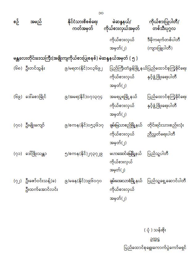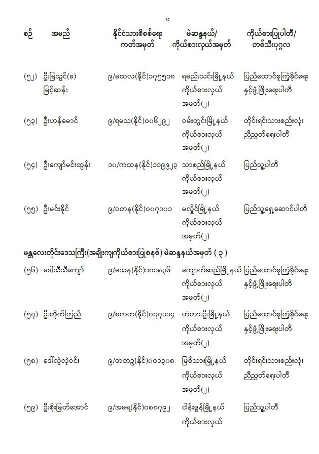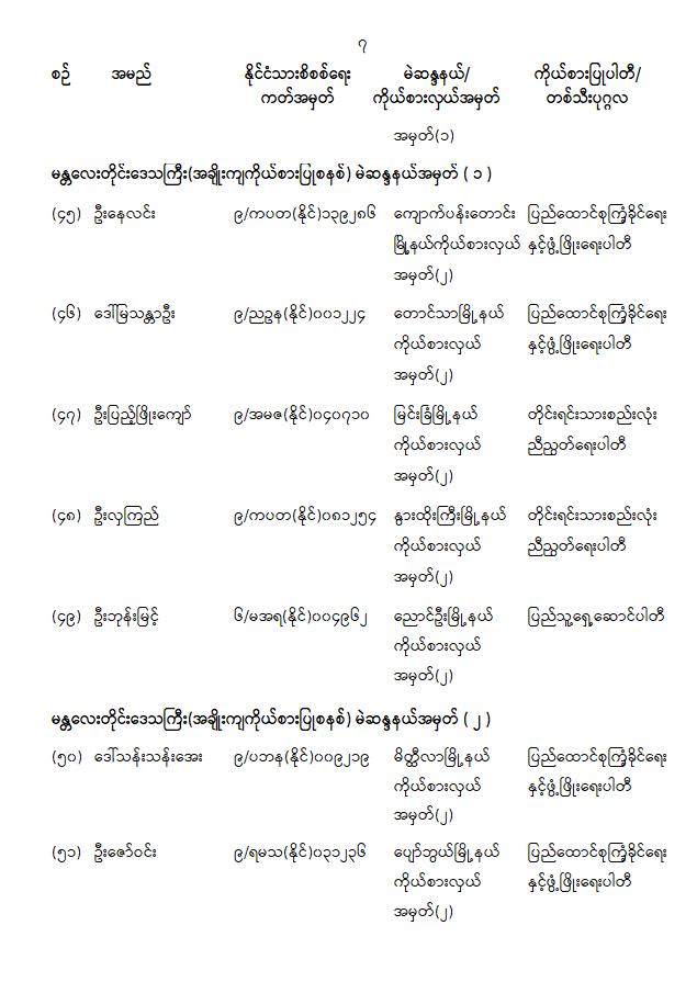 တိုင်းဒေသကြီးလွှတ်တော် သို့မဟုတ် ပြည်နယ်လွှတ်တော်ကိုယ်စားလှယ်အဖြစ် ရွေးကောက်တင်မြှောက်ခံရသူများ အမည်စာရင်းကြေညာခြင်း 01/31/2026 တိုင်းဒေသကြီးလွှတ်တော် သို့မဟုတ် ပြည်နယ်လွှတ်တော်ကိုယ်စားလှယ်အဖြစ် ရွေးကောက်တင်မြှောက်ခံရသူများ အမည်စာရင်းကြေညာခြင်း