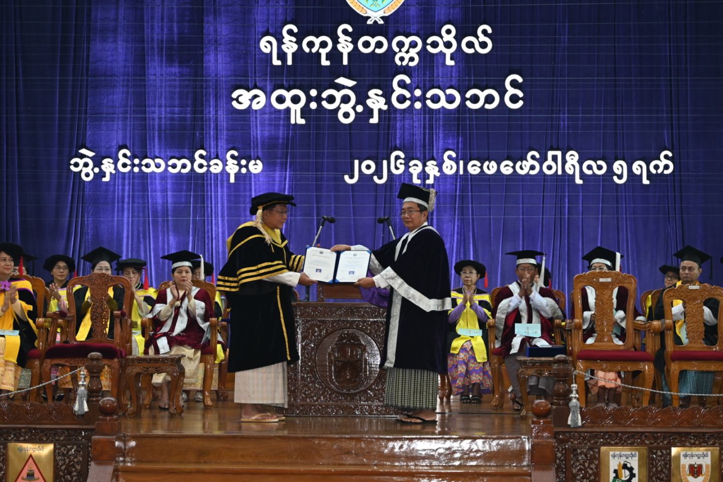 ပြည်ထောင်စုသမ္မတမြန်မာနိုင်ငံတော် ယာယီသမ္မတ နိုင်ငံတော်လုံခြုံရေးနှင့် အေးချမ်းသာယာရေးကော်မရှင်ဥက္ကဋ္ဌ ဗိုလ်ချုပ်မှူးကြီး မင်းအောင်လှိုင်အား ရန်ကုန်တက္ကသိုလ်မှ ဂုဏ်ထူးဆောင် ပြည်သူ့ရေးရာစီမံခန့်ခွဲမှုပါရဂူဘွဲ့ Honorary Doctor of Public Administration (D.P.A. honoris causa) ဘွဲ့အပ်နှင်း