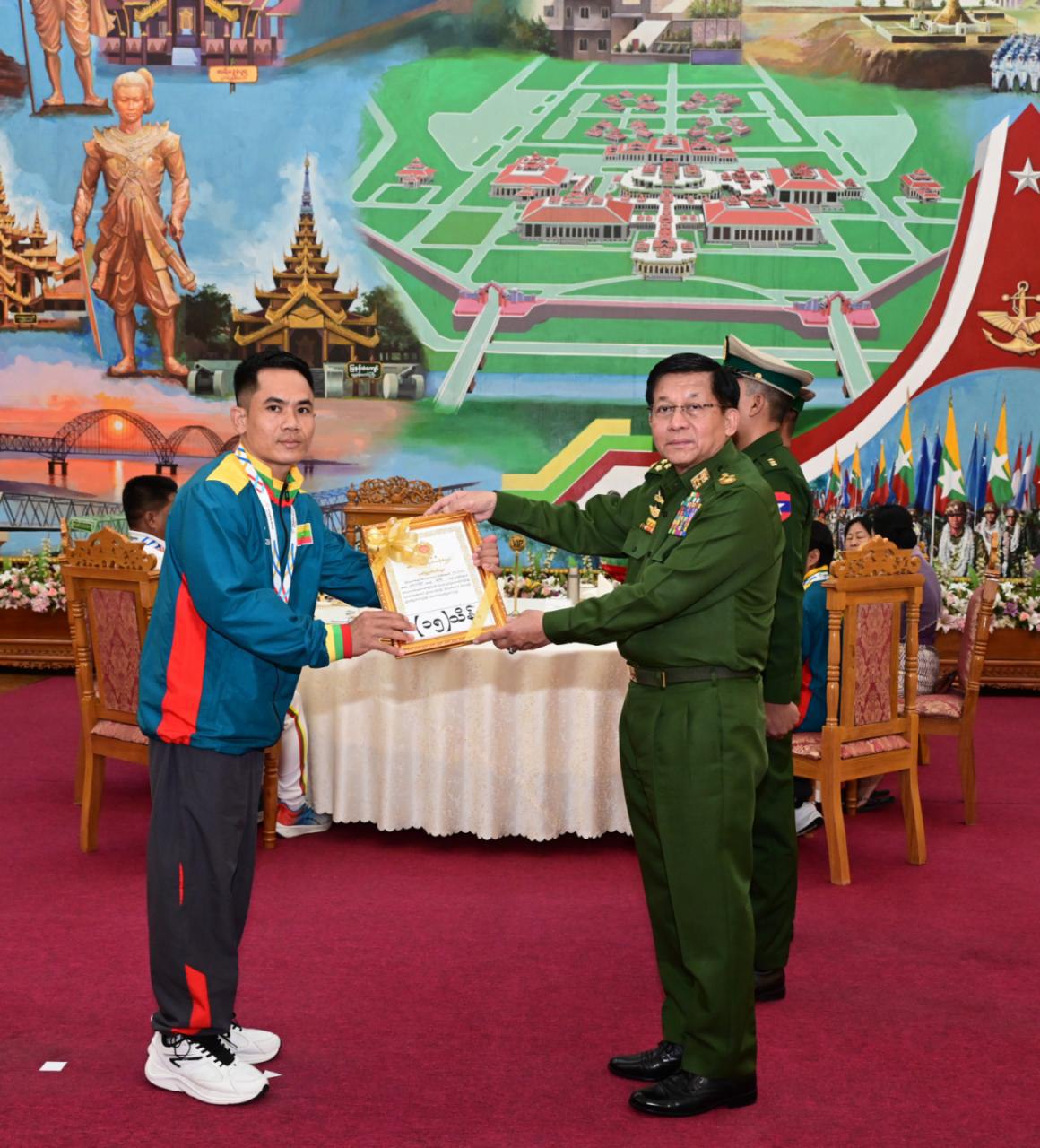 ထို့နောက် (၁၉)ကြိမ်မြောက် အာရှအားကစားပြိုင်ပွဲ၊ (၃၃)ကြိမ်မြောက် အရှေ့တောင်အာရှအားကစားပြိုင်ပွဲနှင့် (၁၃)ကြိမ်မြောက် အာဆီယံမသန်စွမ်းအားကစားပြိုင်ပွဲတို့တွင် ဆုတံဆိပ်များရယူဆွတ်ခူးပေးခဲ့ကြသည့် တပ်မတော်သားအားကစားသမားများနှင့်နည်းပြများအား ဂုဏ်ပြုဆုများချီးမြှင့်ခြင်း အခမ်းအနားကို ကျင်းပပြုလုပ်ရာ နိုင်ငံတော်လုံခြုံရေးနှင့်အေးချမ်းသာယာရေးကော်မရှင်ဥက္ကဋ္ဌ တပ်မတော်ကာကွယ်ရေးဦးစီးချုပ်က (၁၉)ကြိမ်မြောက် အာရှအားကစားပြိုင်ပွဲတွင် ပိုက်ကျော်ခြင်း (အသင်းလိုက်)ပြိုင်ပွဲ၌ ရွှေတံဆိပ်ဆုရရှိခဲ့သည့် အရာခံဗိုလ်သန့်ဇင်ဦး၊ (၁၃)ကြိမ်မြောက် အာဆီယံမသန်စွမ်းအားကစား ပြိုင်ပွဲတွင် ပြေးခုန်ပစ်(လှံတံပစ်) (တစ်ဦးချင်း) ပြိုင်ပွဲနှင့် (သံလုံးပစ်)(တစ်ဦးချင်း)ပြိုင်ပွဲတို့၌ ရွှေတံဆိပ်ဆုများရရှိခဲ့သည့် အရာခံဗိုလ် တင်ညို၊ (၃၃) ကြိမ်မြောက် အရှေ့တောင်အာရှအားကစားပြိုင်ပွဲတွင် ခြင်းလုံး(ကွင်းသွင်း)(အသင်းလိုက်)ပြိုင်ပွဲ၌ ငွေတံဆိပ်ဆုရရှိခဲ့သည့် ဒုတိယအရာခံဗိုလ် အောင်ဇော်၊ တပ်ကြပ်/၁၃ ကျော်ဇေယျာဝင်း၊ ဒုတိယတပ်ကြပ် စိုးပိုင်ဦး၊ (၁၃)ကြိမ်မြောက် အာဆီယံမသန်စွမ်းအားကစားပြိုင်ပွဲတွင် ပြေးခုန်ပစ်အားကစားနည်း၌ ရွှေတံဆိပ်ဆု၊ ငွေတံဆိပ်ဆုနှင့် ကြေးတံဆိပ်ဆုများရရှိအောင် နည်းပြပေးနိုင်ခဲ့သည့် ဒုတိယအရာခံဗိုလ် သက်ဝင်းတို့အား တပ်မတော်ကာကွယ်ရေးဦးစီးချုပ်၏ ဂုဏ်ထူးဆောင်လက်မှတ်၊ ဂုဏ်ပြုမှတ်တမ်းလွှာနှင့် ဂုဏ်ပြုချီးမြှင့်ငွေများကို တစ်ဦးချင်းပေးအပ်ချီးမြှင့်သည်။