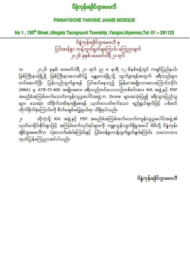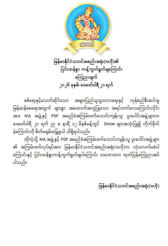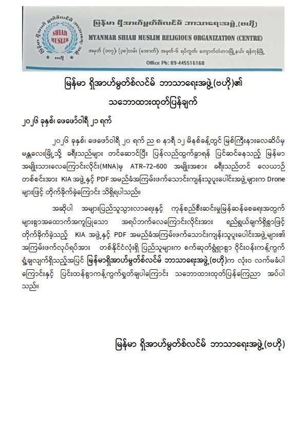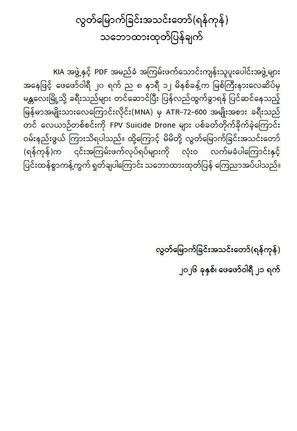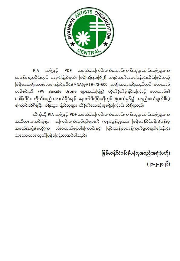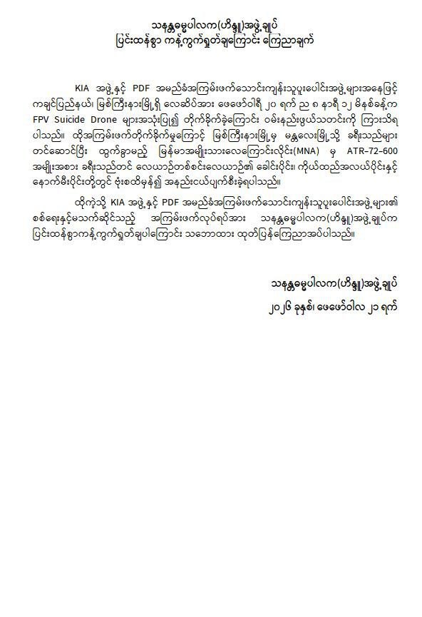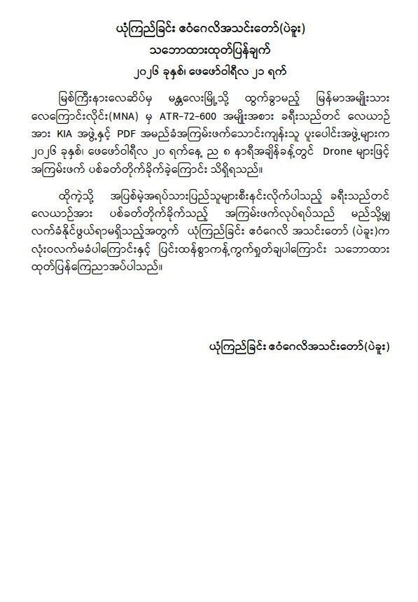 အကြမ်းဖက်အဖွဲ့များအနေဖြင့် စစ်ရေးနှင့်မသက်ဆိုင်သည့် အများပြည်သူ အသုံးပြုလျက်ရှိသော အရပ်ဘက်လေကြောင်းလိုင်းအား ရည်ရွယ်ချက်ရှိစွာဖြင့် တိုက်ခိုက်ခဲ့ခြင်းသည် ဂျီနီဗာကွန်ဗင်းရှင်းများနှင့် အပြည်ပြည်ဆိုင်ရာဥပဒေတို့အရ စစ်ရာဇဝတ်မှု (War Crime) ကို ကျူးလွန်ခြင်းဖြစ်ပြီး ၎င်းတို့၏ အကြမ်းဖက်လုပ်ရပ်များအပေါ် ဒေသခံပြည်သူများအပြင် တစ်နိုင်ငံလုံးရှိ ပြည်သူလူထုတစ်ရပ်လုံးကပါ လုံးဝလက်ခံနိုင်ခြင်းမရှိဘဲ စက်ဆုတ်ရွံရှာစွာ ဝိုင်းဝန်းကန့်ကွက်ရှုတ်ချလျက်ရှိသည်။