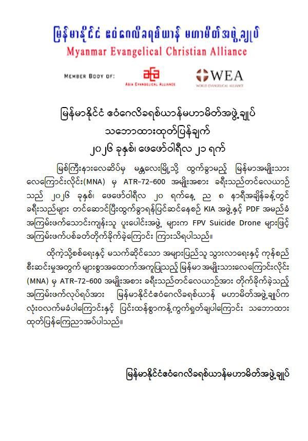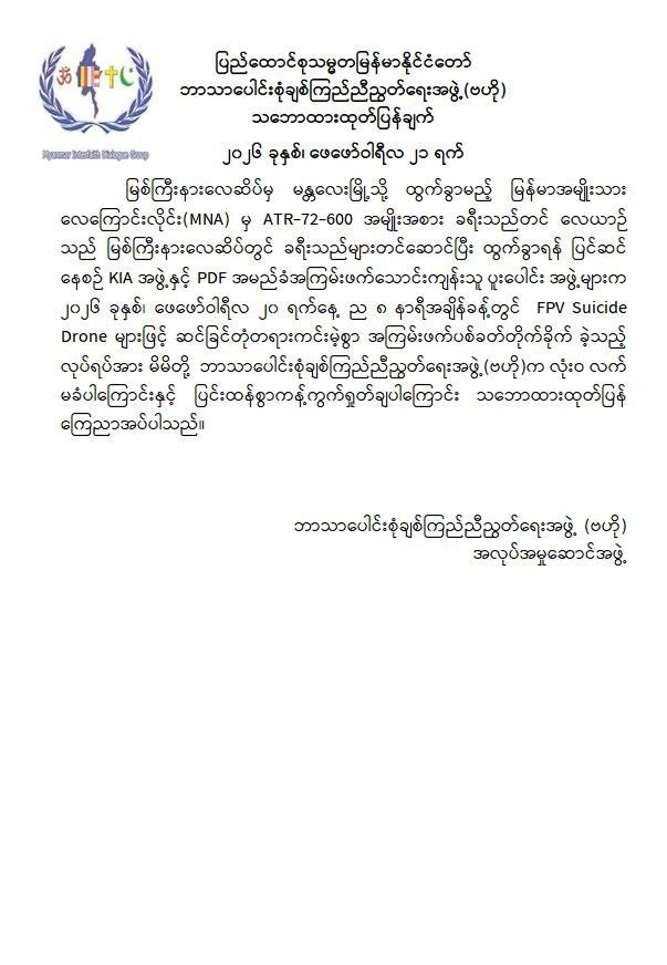 အဆိုပါ ကချင်ပြည်နယ်၏ အဓိကလေကြောင်းဗဟိုချက်တစ်ခုဖြစ်သော အများပြည်သူသွားလာရေးနှင့် ကုန်စည်စီးဆင်းမှုမြန်ဆန်စေရေးအတွက် များစွာအထောက်အကူပြုလျက်ရှိသည့် မြစ်ကြီးနားလေဆိပ်အား KIA အဖွဲ့နှင့် PDFအမည်ခံ အကြမ်းဖက် သောင်းကျန်းသူပူးပေါင်းအဖွဲ့များက ဖေဖော်ဝါရီ ၂၀ ရက် ည ၈ နာရီ ၁၂ မိနစ်ခန့်တွင် FPV Suicide Drone များအသုံးပြု၍ ခရီးသွားပြည်သူများ သေဆုံး၊ ထိခိုက်ဒဏ်ရာရရှိစေရန် ယုတ်မာပက်စက်သော ရည်ရွယ်ချက်ဖြင့် ပစ်ခတ်တိုက်ခိုက်ခဲ့သဖြင့် မြန်မာအမျိုးသားလေကြောင်းလိုင်း (MNA) မှ မြစ်ကြီးနားလေဆိပ်မှ မန္တလေးမြို့သို့ ထွက်ခွာရန်အတွက် ခရီးသည်များတင်ဆောင်ပြီး ပြန်လည်ထွက်ခွာရန် ပြင်ဆင်နေသည့် ATR-72-600 အမျိုးအစား ခရီးသည်တင်လေယာဉ်၏ ခေါင်းပိုင်း၊ ကိုယ်ထည်အလယ်ပိုင်းနှင့် နောက်မီးပိုင်းတို့တွင် ဗုံးစထိမှန်ပျက်စီးခဲ့ပြီး လေယာဉ်ခရီးစဉ်ရပ်နားခဲ့ရသည်။