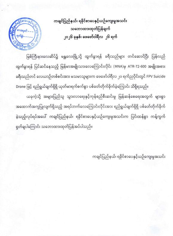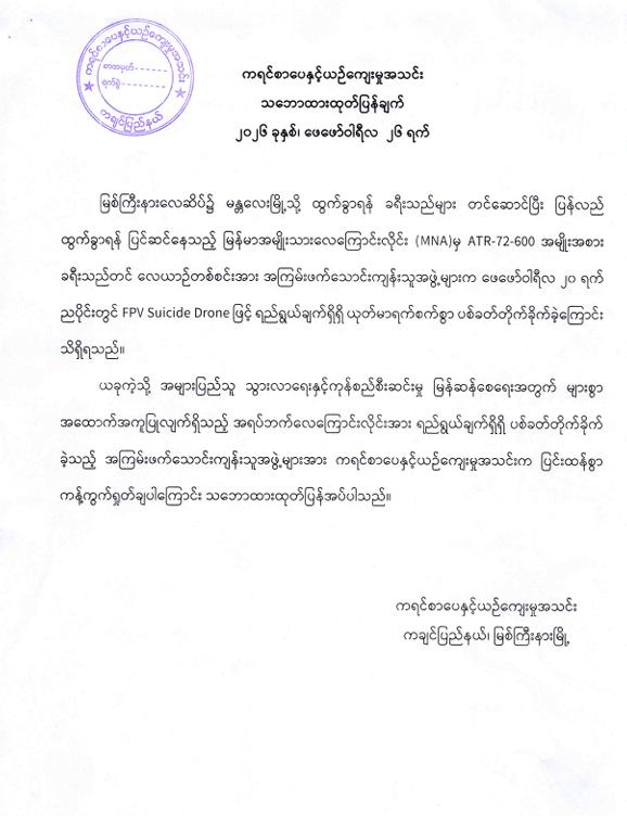 မြစ်ကြီးနားလေဆိပ်မှ ခရီးသည်တင်လေယာဉ်အား KIA အဖွဲ့နှင့် PDF အမည်ခံအကြမ်းဖက်သောင်းကျန်းသူ ပူးပေါင်းအဖွဲ့များက ယုတ်မာပက်စက်စွာ FPV suicide drone များဖြင့် ပစ်ခတ်တိုက်ခိုက်ခဲ့မှုအပေါ် ပြင်းထန်စွာကန့်ကွက်ရှုတ်ချကြောင်း သဘောထားထုတ်ပြန်ချက်များ ထပ်မံထုတ်ပြန်