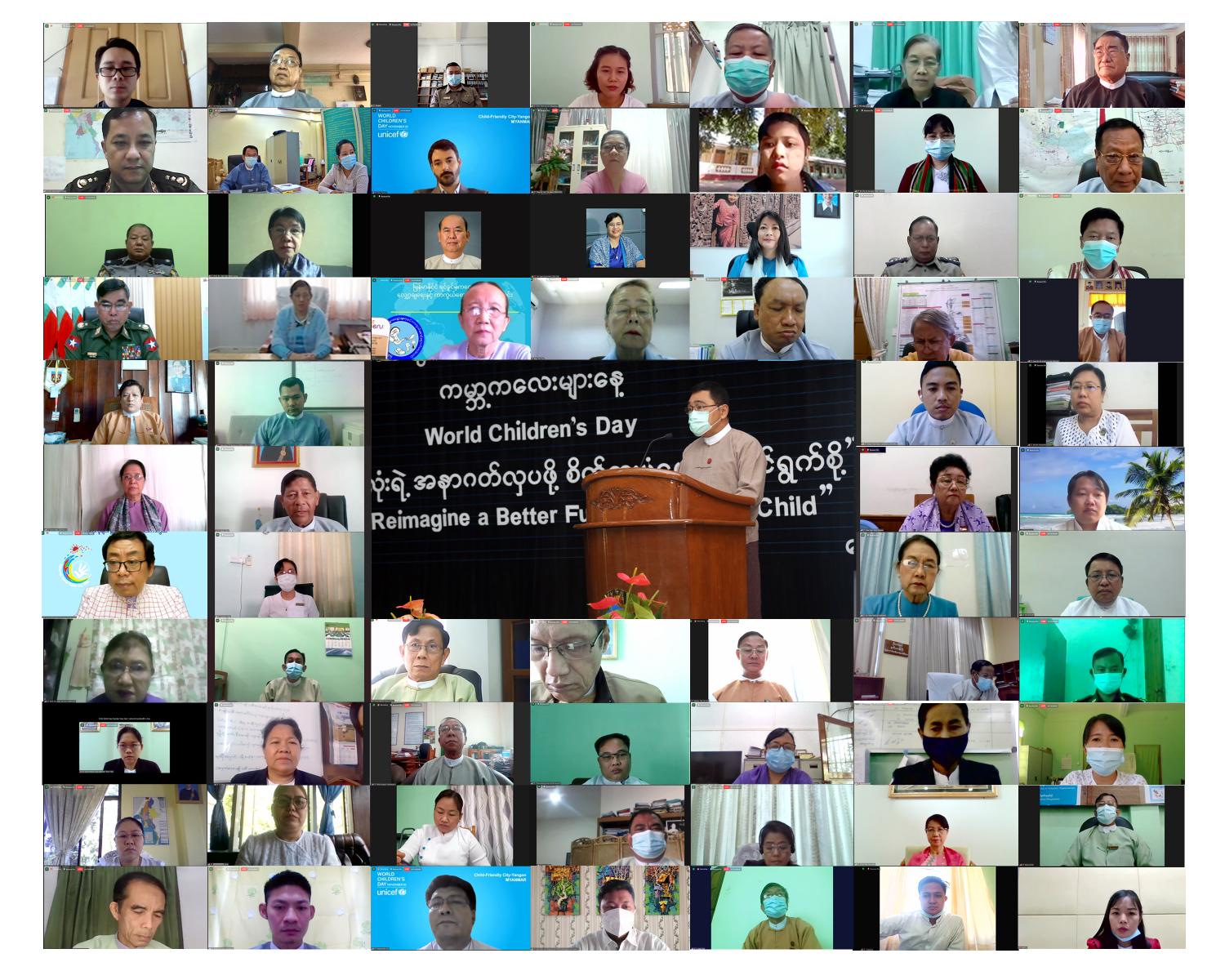 မြန်မာနိုင်ငံအနေဖြင့် ကလေးသူငယ် အခွင့်အရေးများ     ဆိုင်ရာ ကုလသမဂ္ဂ ကွန်ဗင်းရှင်း အဖွဲ့ဝင် နိုင်ငံဖြစ်သည့်အတွက် ကော်မတီသို့ ()နှစ်တစ်ကြိမ် အစီရင် ခံစာတင်သွင်းရန်တာဝန်ရှိရာ ၂၀၂၀ ပြည့်နှစ်၊ ဒီဇင်ဘာလကုန်တွင် တင်သွင်းနိုင်ရေး စီစဉ်ဆောင် ရွက်လျက်ရှိကြောင်း၊ ထို့ကြောင့် ၂၀၂၀ ပြည့်နှစ်သည် ကလေးသူငယ်များအတွက် အခွင့်အရေးများ ကိုဖော်ဆောင်ရာတွင် ဒီမိုကရေစီ စံနှုန်းများကို မြှင့်တင်နိုင်သော ပြုပြင်ပြောင်းလဲမှုများကို ဆောင်ရွက်နိုင်ပြီး အခြေခံအုတ်မြစ် ကောင်း များကို ချမှတ်နိုင်သော နှစ်ဖြစ်ကြောင်း၊ ကမ္ဘာ့ကုလ သမဂ္ဂအဖွဲ့ကြီးက ယခုနှစ် ကမ္ဘာ့ကလေး များနေ့အတွက် ချမှတ် ပေးထားသည့်ဆောင်ပုဒ်မှာ “A Day to reimagine a better future for every child” “ကလေးအားလုံးရဲ့ အနာဂတ်လှပဖို့ စိတ်ကူးပုံဖော်ဆောင်ရွက်စို့ဖြစ်ကြောင်း၊ ယခု အချိန်ခါသည် ကိုဗစ်-၁၉ ကပ်ရောဂါကျရောက်ဆဲ ကာလ ဖြစ်သည့်အတွက် ကလေးသူငယ်များ၏ အခွင့်အရေး များဖော်ဆောင်ပေးရာမှာ အခက် အခဲများ ကြုံတွေ့ နေရသော်လည်း လတ်တလော ဖြေရှင်း ဆောင်ရွက်ပေးခြင်းမပြုပါက ကလေးငယ်များ၏ ဘဝတစ်သက်တာလုံးအတွက် ထိခိုက် စေနိုင် မည်ဖြစ်သည့်အတွက် အနာဂတ်မျိုးဆက်သစ်များ အတွက် အားလုံးဝိုင်းဝန်းပူးပေါင်းဆောင် ရွက် ပေးကြရန် တိုက်တွန်းလှုံ့ဆော်ထားခြင်း ဖြစ်ကြောင်း။