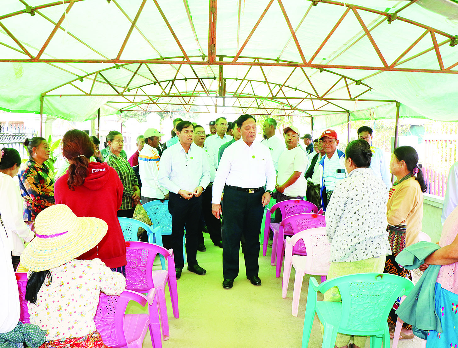 ယင်းနောက် ပြည်ထောင်စုဝန်ကြီးနှင့်အဖွဲ့သည် ပြင်ဦးလွင်မြို့နယ် ကြီးကိုင်ကျေးရွာသို့ သွားရောက်ပြီး ကျေးလက်ဒေသဖွံ့ဖြိုးတိုးတက်ရေးဦးစီးဌာနက ကျေးရွာဖွံ့ဖြိုးတိုးတက်ရေးလုပ်ငန်းစီမံကိန်း (VDP) ထောက်ပံ့ရန်ပုံငွေ၊ ကျေးရွာပြည်သူထည့်ဝင်ငွေတို့ဖြင့် အကောင်အထည်ဖော်ဆောင်ရွက်ခဲ့သောကျေးရွာတွင် လမ်းကတ္တရာခင်းခြင်းလုပ်ငန်း ဆောင်ရွက်ပြီးစီးမှု အခြေအနေများကို ကြည့်ရှုစစ်ဆေးပြီး ကျေးရွာ ယာယီရှင်းလင်းဆောင်၌ ကျေးရွာသူ ကျေးရွာသားများနှင့်တွေ့ဆုံ၍ ပြည်ထောင်စုဝန်ကြီးက ဒေသခံတောင်သူများအနေဖြင့် စိတ်တူကိုယ်တူဆန္ဒတူသူများ စုပေါင်း၍ သမဝါယမအသင်းများဖွဲ့စည်းကာ စီးပွားဖြစ် လယ်ယာကုန်ထုတ်လုပ်ငန်းများ ပေါ်ထွန်းလာရေးအတွက် ပူးပေါင်းလုပ်ဆောင်ကြရန် လိုအပ်ကြောင်း၊ သမဝါယမအသင်းအဖွဲ့စနစ်ဖြင့် ဆောင်ရွက်သည့် တောင်သူများကို လိုအပ်သည့် မျိုးကောင်း မျိုးသန့်၊ သွင်းအားစုများကို စိုက်ပျိုးချိန်မီရရှိရေး ပေါင်းစပ်ဆောင်ရွက်ပေးမည် ဖြစ်ကြောင်းနှင့် ဒေသဖွံ့ဖြိုးရေးဆိုင်ရာများကို ဆွေးနွေးပြောကြားပြီး ဒေသခံပြည်သူများ၏ ဒေသဖွံ့ဖြိုးရေးဆိုင်ရာ တင်ပြချက်များကို ပေါင်းစပ်ဖြည့်ဆည်း ဆောင်ရွက်ပေးသည်။