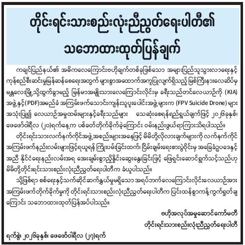 တိုင်းရင်းသားစည်းလုံးညီညွတ်ရေးပါတီ၏ သဘောထားထုတ်ပြန်ချက်