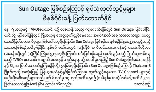 Sun Outage ဖြစ်စဉ်ကြောင့် ရုပ်သံထုတ်လွှင့်မှုများ မိနစ်ပိုင်းခန့် ပြတ်တောက်နိုင်