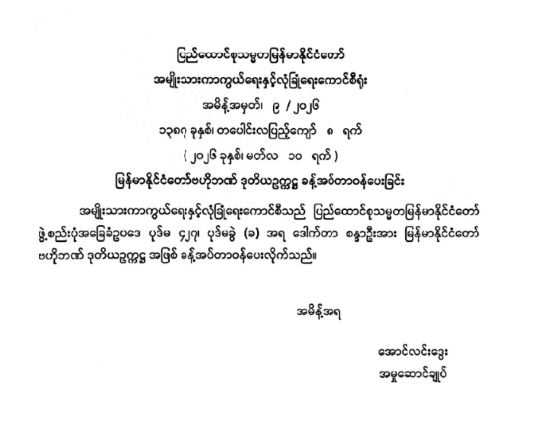 မြန်မာနိုင်ငံတော်ဗဟိုဘဏ် ဒုတိယဥက္ကဋ္ဌ ခန့်အပ်တာဝန်ပေးခြင်း
