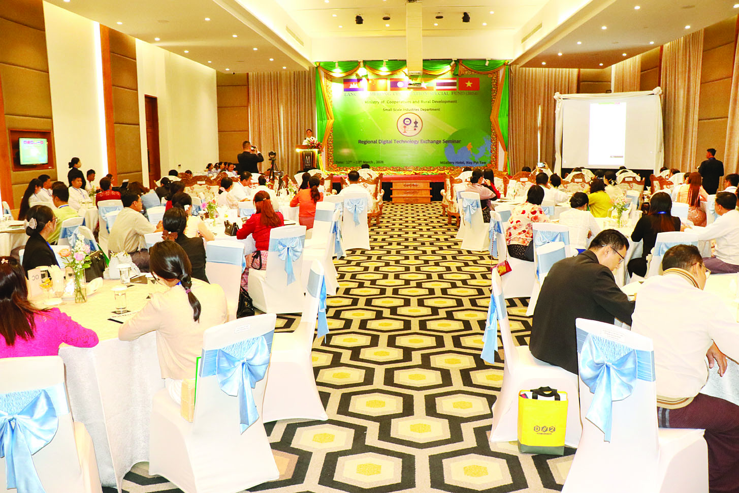 သမဝါယမနှင့်ကျေးလက်ဖွံ့ဖြိုးရေးဝန်ကြီးဌာန အသေးစားစက်မှုလက်မှုလုပ်ငန်းဦးစီးဌာန၏ မဲခေါင်-လန်ချန်း ပူးပေါင်းဆောင်ရွက်မှုဆိုင်ရာ အထူးရန်ပုံငွေ (၂၀၂၄) ဖြင့် ဆောင်ရွက်သည့် “ဒေသတွင်း ဒီဂျစ်တယ်နည်းပညာနှီးနှောဖလှယ်ပွဲ” ဖွင့်ပွဲအခမ်းအနားကို ယနေ့နံနက်ပိုင်းက နေပြည်တော်ရှိ M-Gallery ဟိုတယ်၌ ကျင်းပရာ ပြည်ထောင်စုဝန်ကြီး ဦးလှမိုး၊ ညွှန်ကြားရေးမှူးချုပ်၊ ဒုတိယညွှန်ကြားရေးမှူးချုပ်များ၊ မြန်မာနိုင်ငံဆိုင်ရာ တရုတ်ပြည်သူ့သမ္မတနိုင်ငံသံရုံးမှ တာဝန်ရှိသူများ၊ ဖိတ်ကြားထားသော ဧည့်သည်တော်များ၊ ဒစ်ဂျစ်တယ်နည်းပညာဆိုင်ရာပညာရှင်များနှင့် တာဝန်ရှိသူများ တက်ရောက်သည်။