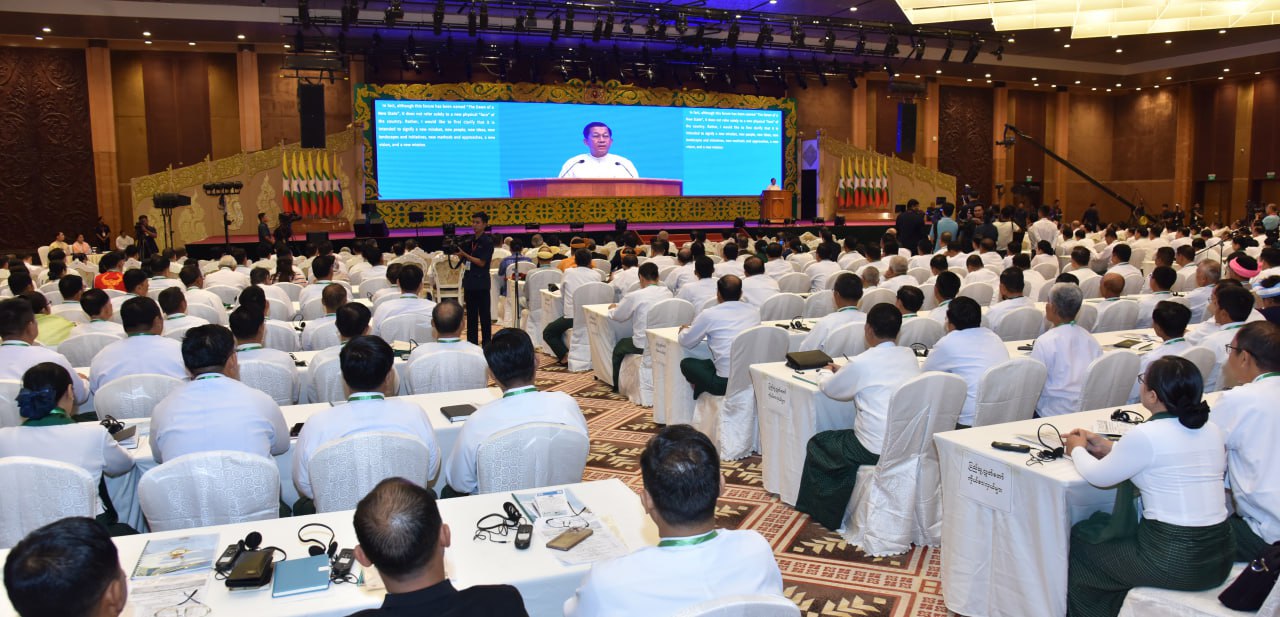 မြန်မာ့မျက်နှာစာသစ်ဖိုရမ်(ယုံကြည်မှု၊ တည်ငြိမ်အေးချမ်းမှုနှင့် ဖွံ့ဖြိုးတိုးတက်မှု) Forum on The Dawn of A New State (Trust, Stability & Development) ဖွင့်ပွဲအခမ်းအနားအား ယနေ့နံနက်ပိုင်းတွင် နေပြည်တော်ရှိ မြန်မာအပြည်ပြည်ဆိုင်ရာ ကွန်ဗင်းရှင်းဗဟိုဌာန(၁) (MICC-1) ၌ ကျင်းပပြုလုပ်ရာ ပြည်ထောင်စုသမ္မတမြန်မာနိုင်ငံတော် ယာယီသမ္မတ နိုင်ငံတော်လုံခြုံရေးနှင့် အေးချမ်းသာယာရေးကော်မရှင်ဥက္ကဋ္ဌ ဗိုလ်ချုပ်မှူးကြီး မင်းအောင်လှိုင် တက်ရောက်အမှာစကားပြောကြားသည်။