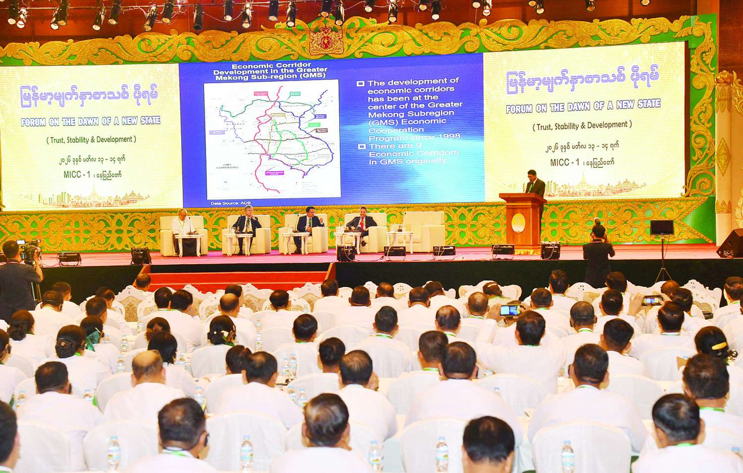 “မြန်မာ့မျက်နှာစာသစ်ဖိုရမ်” (ယုံကြည်မှု၊ တည်ငြိမ်အေးချမ်းမှုနှင့် ဖွံ့ဖြိုးတိုးတက်မှု) “Forum on The Dawn of A New State”(Trust, Stability & Development) ပထမနေ့ကို ယနေ့တွင် နေပြည်တော်ရှိ မြန်မာအပြည်ပြည်ဆိုင်ရာကွန်ဗင်းရှင်းဗဟိုဌာန (၁) (MICC I) ၌ ကျင်းပသည်။