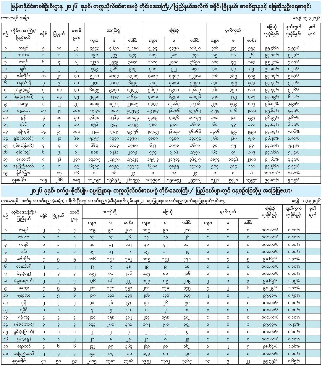 ၂၀၂၆ ခုနှစ် တက္ကသိုလ်ဝင်စာမေးပွဲနှင့် ၂၀၂၆ ခုနှစ် စက်မှု၊ စိုက်ပျိုး၊ မွေးမြူရေး တက္ကသိုလ်ဝင်စာမေးပွဲများကို ယနေ့နံနက်ပိုင်းတွင် နိုင်ငံခြားစာစစ်ဌာနအပါဝင် တစ်နိုင်ငံလုံးအတိုင်းအတာဖြင့် ဆက်လက်ကျင်းပသည်။
