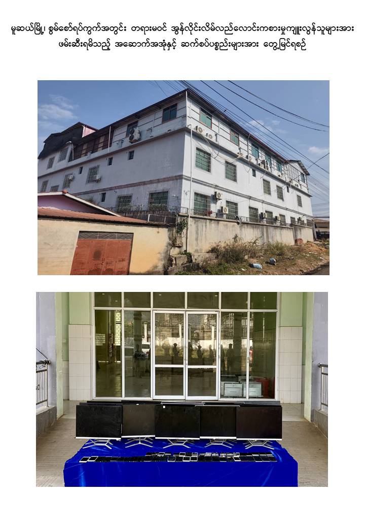 ထိုသို့ အွန်လိုင်းလိမ်လည်လောင်းကစားမှု တိုက်ဖျက်ရေးလုပ်ငန်းစဉ်များကို အွန်လိုင်းလိမ်လည်လောင်းကစားမှုဆောင်ရွက်လျက်ရှိရာ မူဆယ်မြို့၊ ကောင်းမှုတုံရပ်ကွက်၊ တော်ရွက်ရပ်ကွက်နှင့် စွမ်စော်ရပ်ကွက်များအတွင်း အွန်လိုင်းလိမ်လည်လောင်းကစားမှုလုပ်ငန်းများ အခြေပြုလုပ်ကိုင်လျက်ရှိကြောင်း ဒေသခံတာဝန်သိပြည်သူများ၏ သတင်းပေးပို့မှုအရ ရှမ်းပြည်နယ် (မြောက်ပိုင်း) အတွင်း နယ်မြေလုံခြုံရေးဆောင်ရွက်နေသော လုံခြုံရေးတပ်ဖွဲ့ဝင်များသည် ယနေ့နံနက်ပိုင်းတွင် အဆိုပါနေရာများသို့သွားရောက်၍ လိုအပ်သည့် စုံစမ်းစစ်ဆေးခြင်းနှင့် ရှာဖွေဖော်ထုတ်ခြင်းများကို တစ်ချိန်တည်း တစ်ပြိုင်တည်းဆောင်ရွက်ခဲ့သည်။