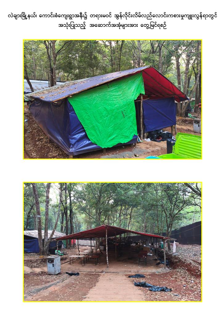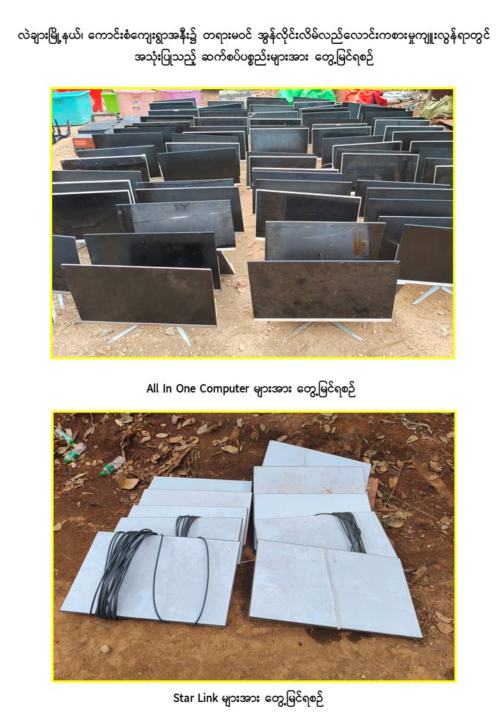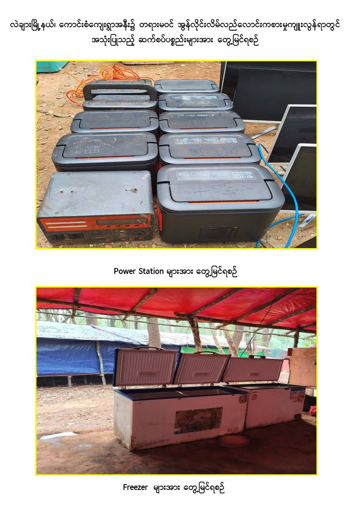 ထို့ပြင် နယ်မြေလုံခြုံရေးဆောင်ရွက်နေသော လုံခြုံရေးတပ်ဖွဲ့ဝင်များသည် ရှမ်းပြည်နယ်(တောင်ပိုင်း)၊ လဲချားမြို့နယ်၊ ကောင်းစံကျေးရွာအနီးတစ်ဝိုက်တွင် နယ်မြေရှင်းလင်းရေးလုပ်ငန်းများဆောင်ရွက်စဉ် ယနေ့ညနေပိုင်း၌ အဆိုပါကျေးရွာ၏ အနောက်ဘက် မီတာ ၃၀၀၀ ခန့်အကွာတွင် အလျား ၁၃၀ ပေ၊ အနံ ၅၀ ပေရှိ အဆောက်အအုံ ၂ လုံး၊ အလျား ၉၀ ပေ၊ အနံ ၃၀ ပေရှိ လူနေအဆောက်အအုံ ၃ လုံး၊ အလျား ၆၀ ပေ၊ အနံ ၃၀ ပေရှိ လူနေအဆောက်အအုံ ၃ လုံး၊ အလျား ၁၅၀ ပေ၊ အနံ ၅၀ ပေရှိ ဂိုဒေါင် ၁ လုံး၊ အလျား ၁၈၀ ပေ၊ အနံ ၆၀ ပေရှိ အဆောက်အအုံ ၁ လုံး၊ Starlink ၁၀ လုံး၊ All in One ကွန်ပျူတာ ၅၅ လုံး၊ Power Station ၁၀ လုံးနှင့် ဆက်စပ်ပစ္စည်းများအား ထပ်မံဖော်ထုတ်သိမ်းဆည်းနိုင်ခဲ့ကြောင်း သိရှိရသည်။